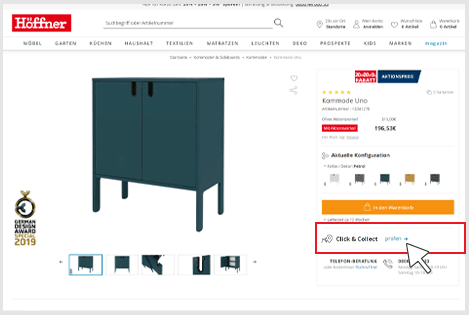 • Click & Collect wird in vielen unserer Einrichtungshäuser angeboten. Um Produkte zu finden für die Click & Collect angeboten wird, können Sie in vielen Kategorien die praktische Filterfunktion nutzen. Ob Ihre Wunschfiliale aktuell Click & Collect anbietet, entnehmen Sie bitte den Standortseiten.