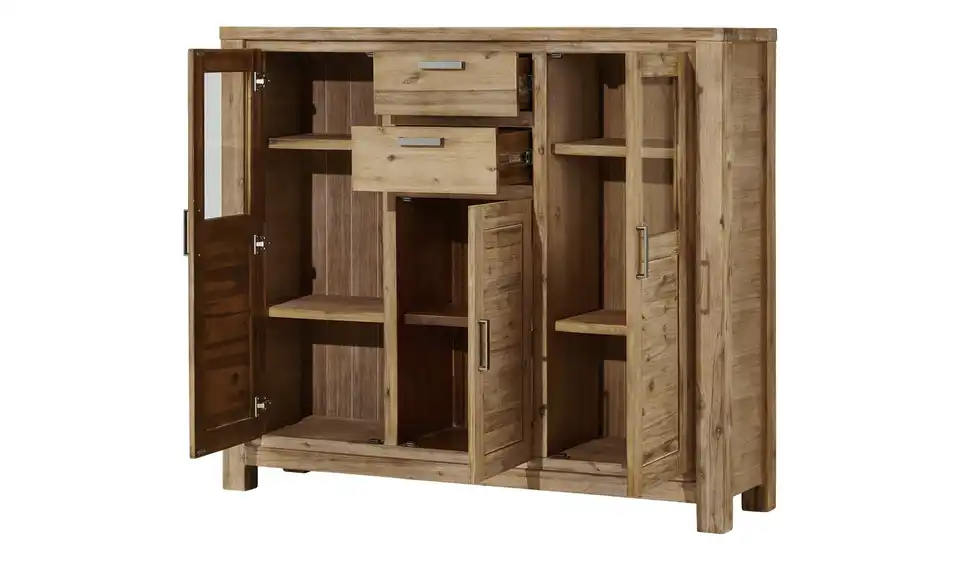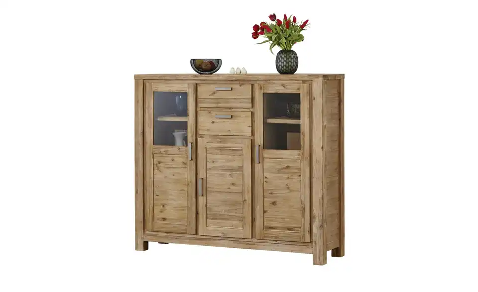 - Mehr zu MaterialKorpus und Front aus Akazie massiv sandfarben gebeizt und lackiertSeiten aus Akazie furniert sandfarben gebeizt und lackiert