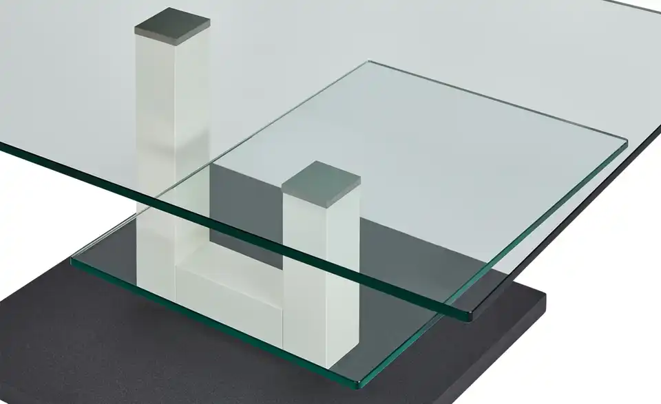 Der Couchtisch Hadar ist nicht nur attraktiv anzuschauen, sondern auch praktisch. Das macht ihn zum Highlight Ihres Wohnzimmers. Der Tisch besteht aus hochwertigen Materialien und ist mit dem Gütesiegel Made in Germany ausgezeichnet. Hadar verfügt über ein zweigeteiltes Säulengestell, dass Tischplatte und Ablage trägt. Die beiden Säulen sind weiß lackiert und setzen sich somit von den Glasplatten ab. Diese bestehen beide aus Klarglas und sind transparent. Einen dramatischen Kontrast stellt die Bodenplatte dar. Sie ist anthrazitfarben. Praktisch: Hadar ist mit Rollen ausgestattet und kann dadurch flexibel bewegt werden.Lieferung & Versand