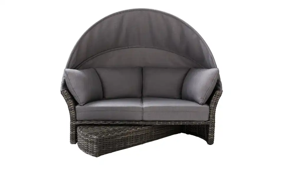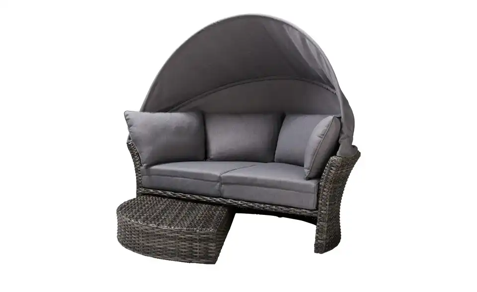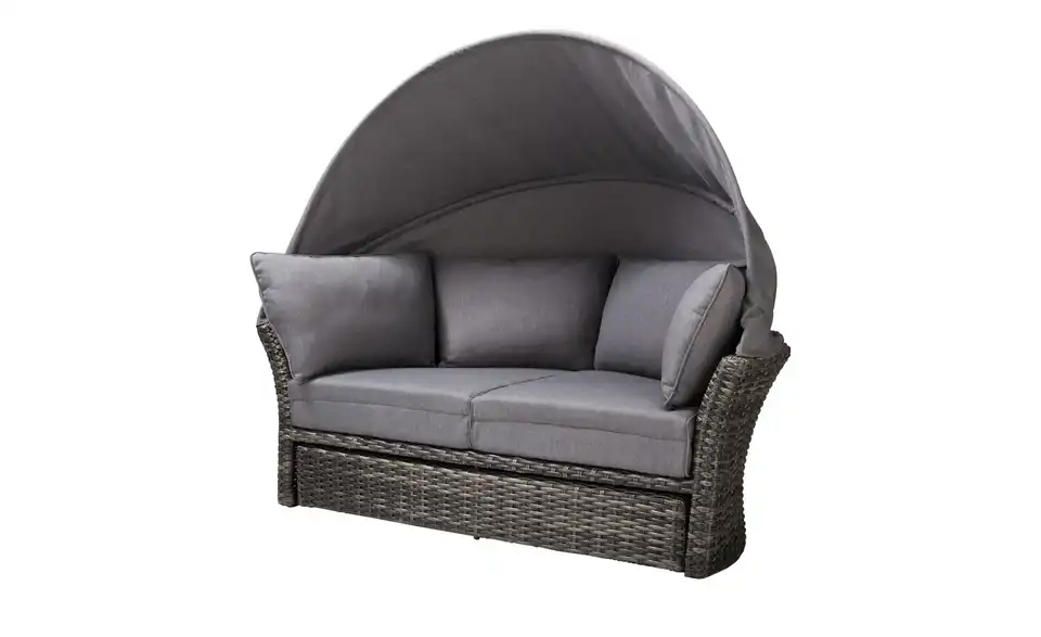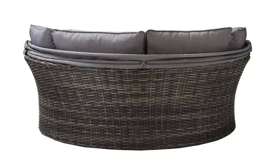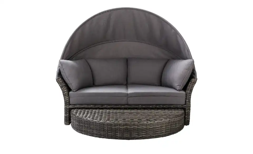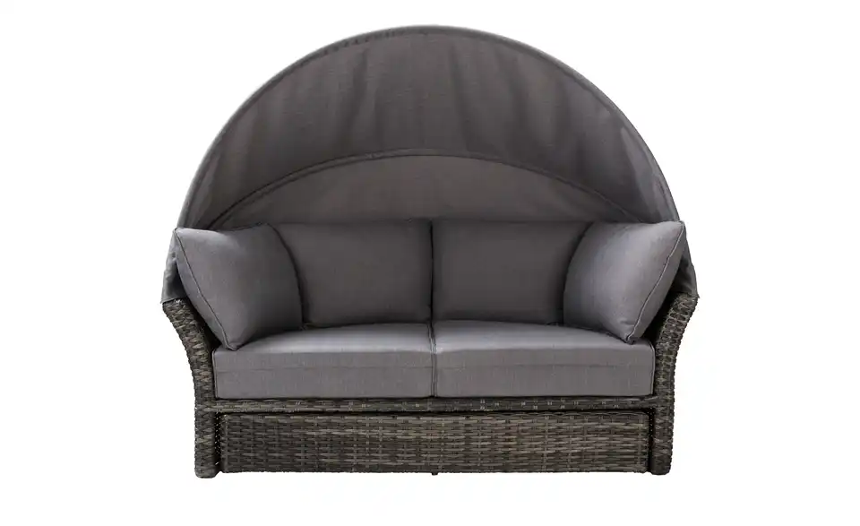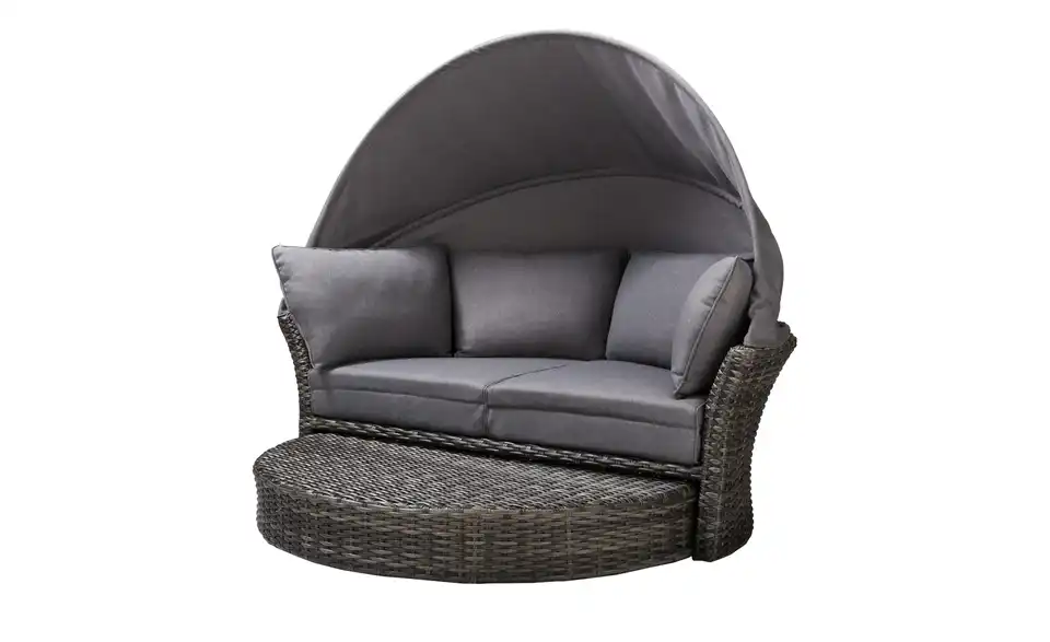 Sommer, Sonne und eine Insel zur Erholung: Die Loungeinsel Mauritius von a casa mia lädt Sie zur puren Entspannung ein. Die Loungeinsel ist ein Sofa in halbrunder Form – und aus strapazierfähigem Polyrattan gefertigt. Das Fußteil ist einfach ausdrehbar. So entsteht die runde Relaxinsel. Wenn Sie die Beine lieber nicht hochlegen möchten, wird das Fußteil wieder eingedreht. Es verschwindet dann ganz unterhalb der Sitzfläche. Die passenden Auflagen für Sitzfläche, Fußablage und Rücken sind im Lieferumfang enthalten. Selbstverständlich sind diese farblich zum grauen Polyrattan abgestimmt. Dank des klappbaren Dachs sind Sie vor der Sonne geschützt. Eine Schutzhülle für Mauritius ist ebenfalls im Lieferumfang enthalten.Lieferung & Versand
