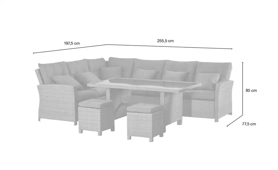 - Mehr zu MaßenSofa 3-sitzig ca.179x79x85cmEcksofa 3-sitzig ca.198x79x85cmTisch ca.147x86x68cmHocker je ca.38x38x46cm