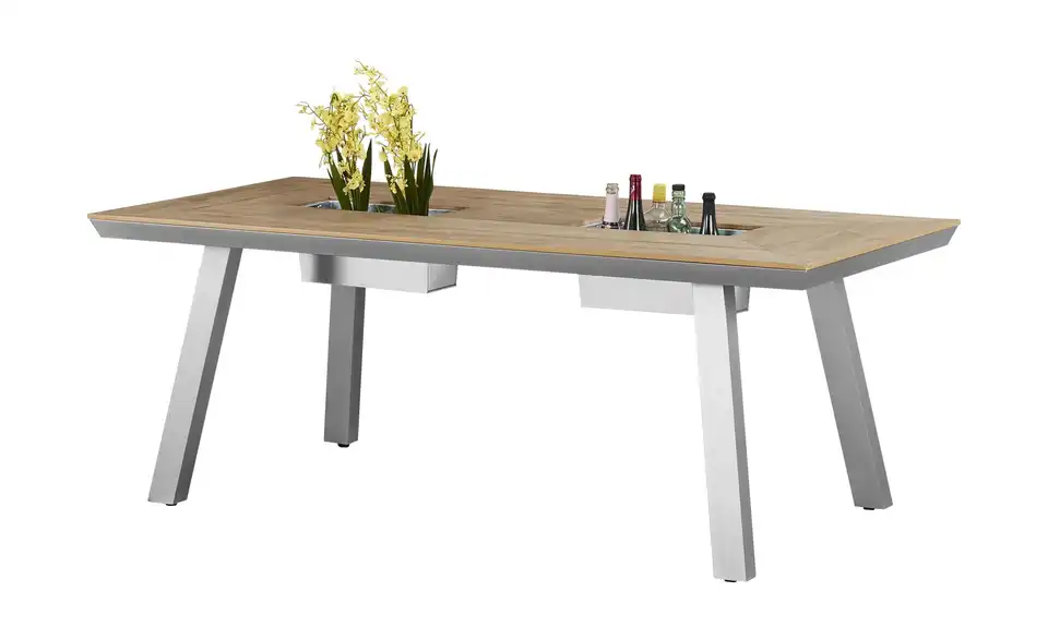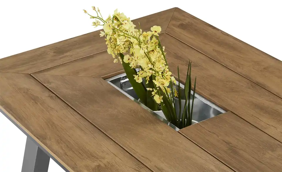 Mit dem Tisch Kansas wird die nächste Gartenparty zum Erfolg. Dank seiner Länge von 200 Zentimetern bietet Kansas viel Platz für Sie und Ihre Gäste. Die große Tischplatte ist aus Polywood – einem Kunststoff in Teakoptik. In der Mitte des Tisches befinden sich zwei Einsätze aus Zinkblech. Sie können darin Flaschen aufbewahren. Oder die Einsätze als Pflanzschalen nutzen.Lieferung & Versand