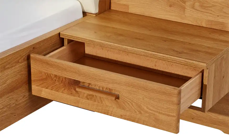 Die Bettanlage Kyran wird inklusive Nachtkonsolen geliefert. Bettgestell und Nachtschränke sind aus massiver Eiche gefertigt. Das Kopfteil des Bettes ist weich gepolstert und mit Kunstleder bezogen. Der helle Magnolie-Ton passt gut zum Holzdekor. Für praktischen Stauraum sorgen die beiden Schubkästen. Je einer befindet sich in den beiden Nachtkonsolen.bewusst wohnen