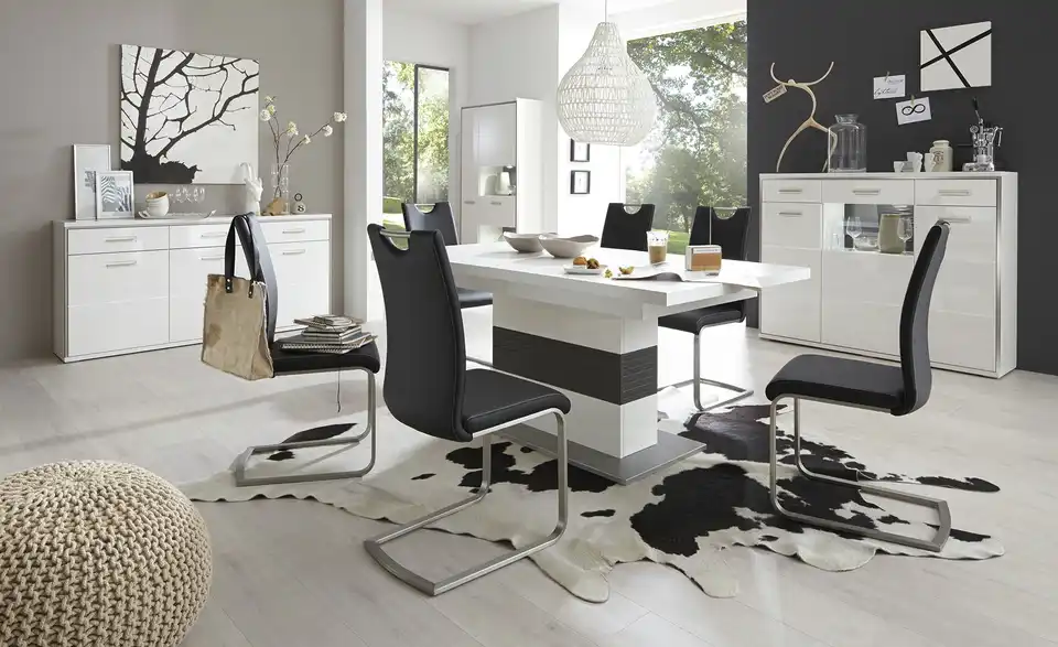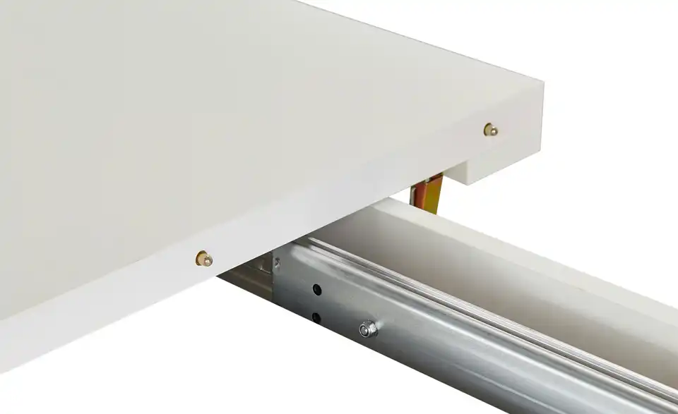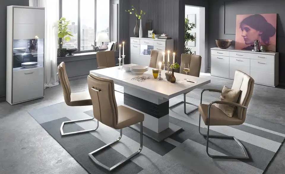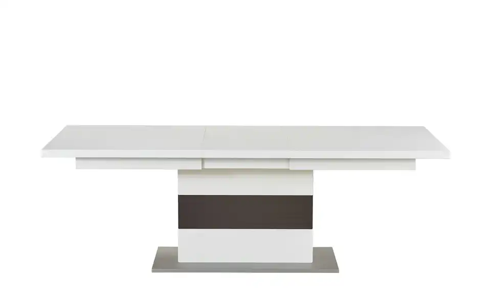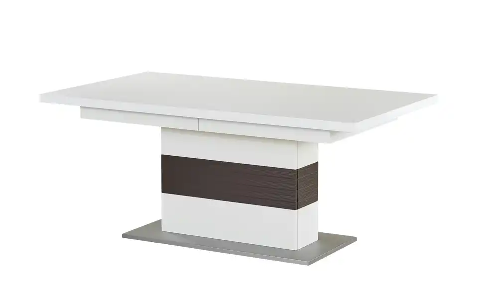 Der Ausziehtisch Setto besticht durch sein markantes Design mit der großen Säule. Diese trägt eine 1,80 m lange Tischplatte, die sich unkompliziert auf eine Länge von 2,80 m ausziehen lässt. Die Platte und die Säule sind weiß und haben eine freundliche, wohnliche Ausstrahlung. Die Säule ist mit einer Absetzung in 3D-Optik verziert. Eine rechteckige, silberfarbene Fußplatte gibt dem Tisch festen Stand.Lieferung & Versand