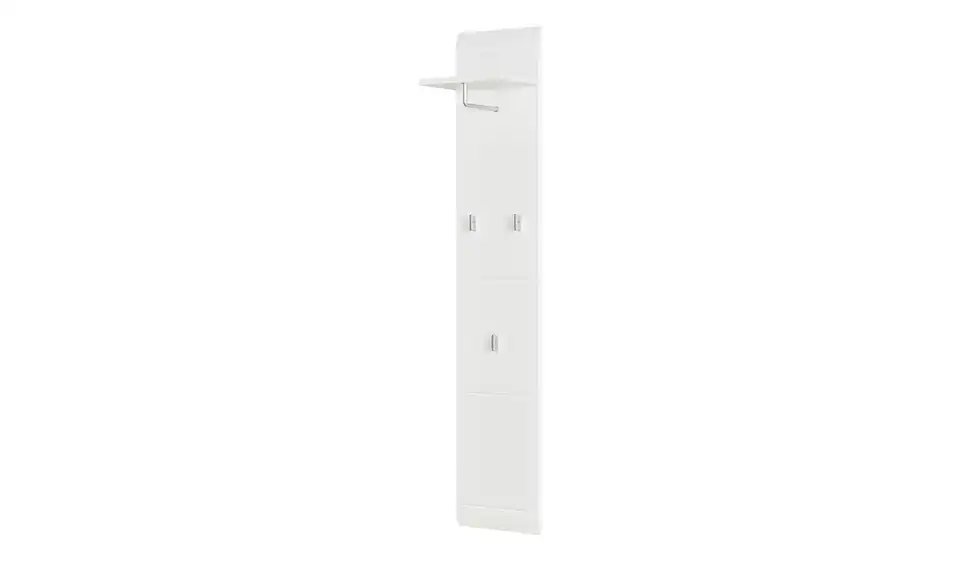 Jacke, Mütze und sogar Schirm können Sie an das Garderobenpaneel AKZENT hängen, wenn Sie zur Tür hineinkommen. Das Paneel ist in einem strahlenden Weiß gehalten. Akzente setzt das exquisite Design. So sind die oberen und unteren Enden des Paneels leicht abgerundet. Gradlinige Einkerbungen unterteilen das hochglänzende Paneel außerdem optisch. AKZENT verfügt über eine Hutablage. Daran ist die stabile Kleiderstange befestigt. Außerdem stehen Ihnen drei Haken zur Verfügung.Lieferung & Versand