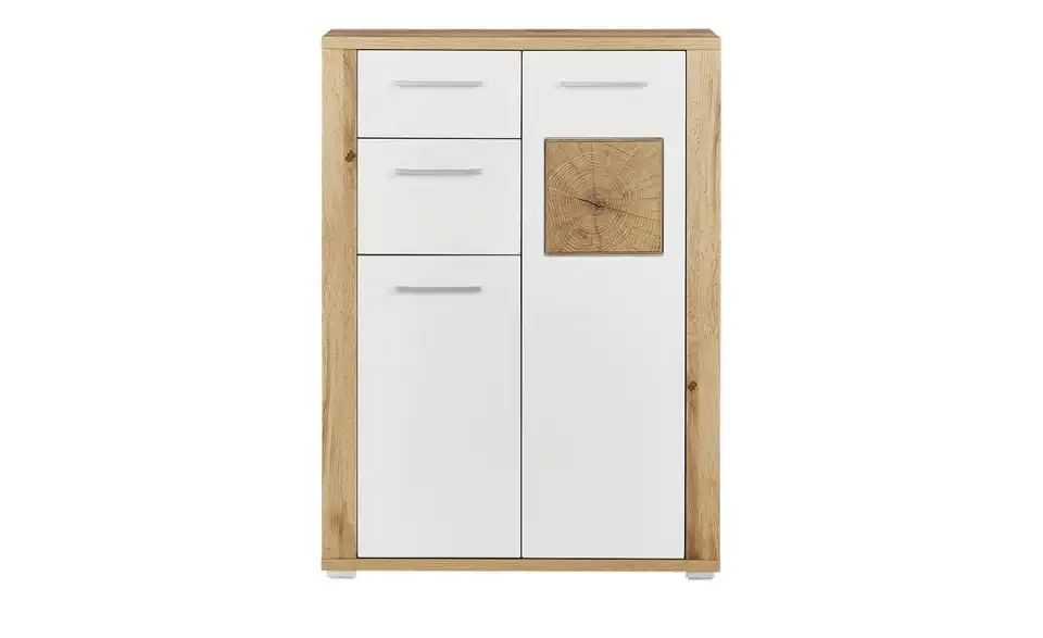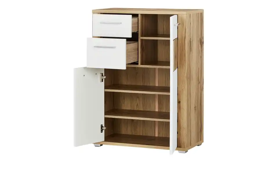 Wenn sie nicht gerade am Fuß sind, gehören Schuhe in einen Schuhschrank. So wie den Schuhschrank Yambio von uno. Im Schrankinneren stehen Ihnen drei große und zwei etwas kleinere Fächer zur Verfügung. Durch die beiden Türen werden die Schuhe vor Staub geschützt. Neben Platz für Schuhe bietet Yambio zwei Schubladen. Beide sind mit einem Selbsteinzug und einer Soft-Close-Funktion ausgestattet. Der Korpus in Eiche Altholz (Nachbildung) wird von weißen Fronten abgesetzt. Ein Eyecatcher ist die Absetzung in Hirnholzoptik an der rechten Tür.Lieferung & Versand
