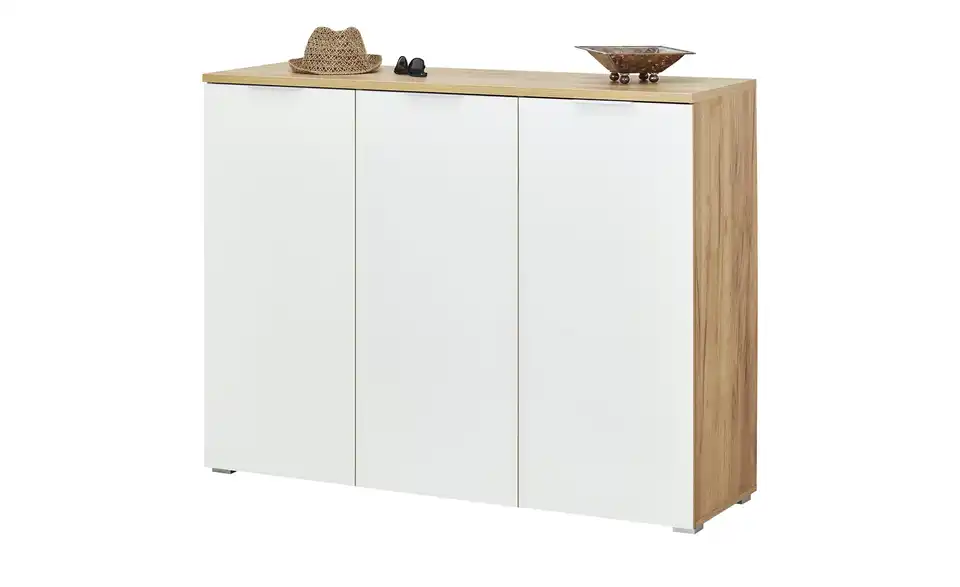 Bis zu 30 Paar Schuhe passen in den Schuhschrank Bent von uno. Sie werden hinter den drei Türen verstaut. Der Stauraum ist in 15 Fächer unterteilt. Praktisch: Die 12 Einlegeböden können Sie in der Höhe verstellen – und so die Größe der einzelnen Fächer nach Bedarf anpassen. Korpus, Böden und alle Innenflächen haben ein Dekor in Navarra Eiche (Nachbildung). Es verfügt über eine natürlich wirkende Maserung mit Farbverläufen. Die Front setzt sich in einem strahlendschönen Weiß ab. Die Oberfläche der drei Türen besteht aus Glas und hat einen leichten Glanz.Lieferung & Versand