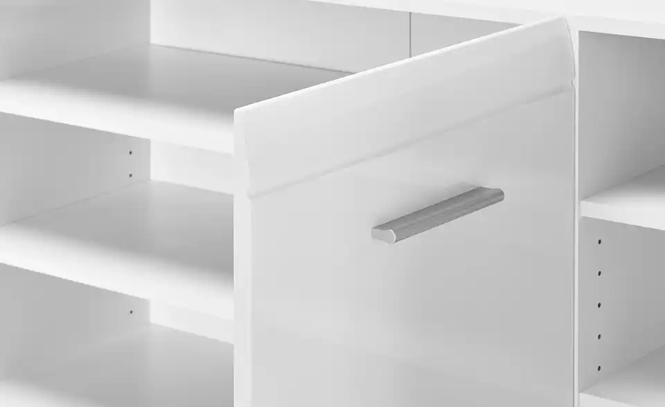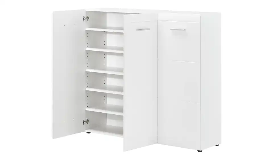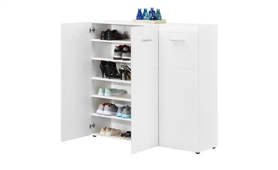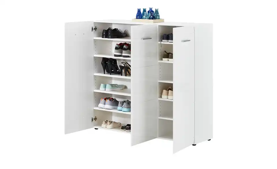 Die Schuhe von der ganzen Familie passen in den Schuhschrank AKZENT. Hinter den beiden Türen stehen Ihnen sechs Fächer zur Verfügung, die mit Sneakern, Pumps und Halbschuhen befüllt werden können. Die fünf Einlegeböden können Sie in der Höhe verstellen – und so die Größe der einzelnen Fächer anpassen. AKZENT ist komplett weiß. Die Front fällt durch ihr exquisites Hochglanzfinish auf.Lieferung & Versand