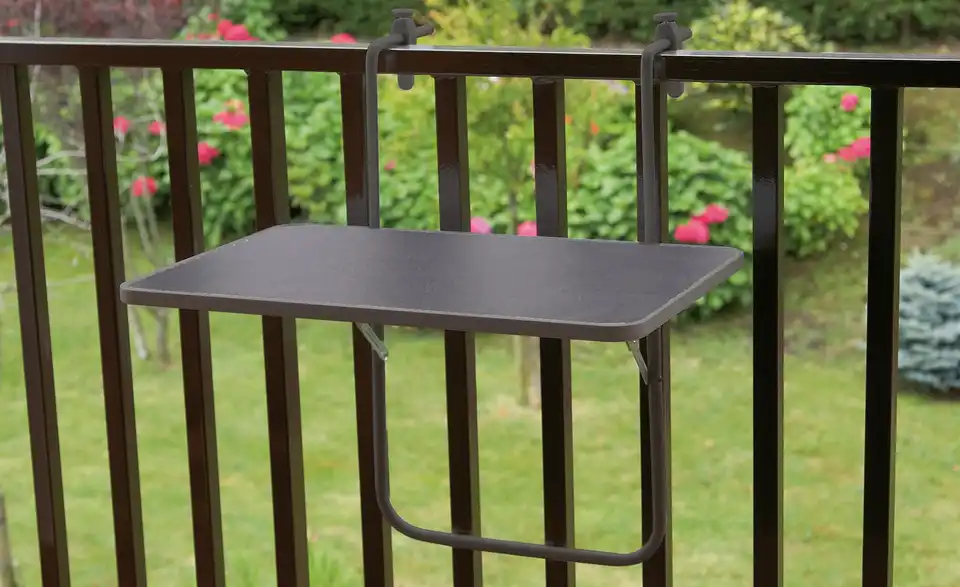 Dieser Balkon-Hängetisch ist auch für ganz kleine Balkons geeignet. Das Tischchen wird einfach an der Brüstung des Balkons befestigt. Wenn Sie den Tisch nutzen möchten, klappen Sie die Tischplatte hoch. Bei Nichtnutzung wird sie genauso leicht wieder heruntergeklappt.Lieferung & Versand