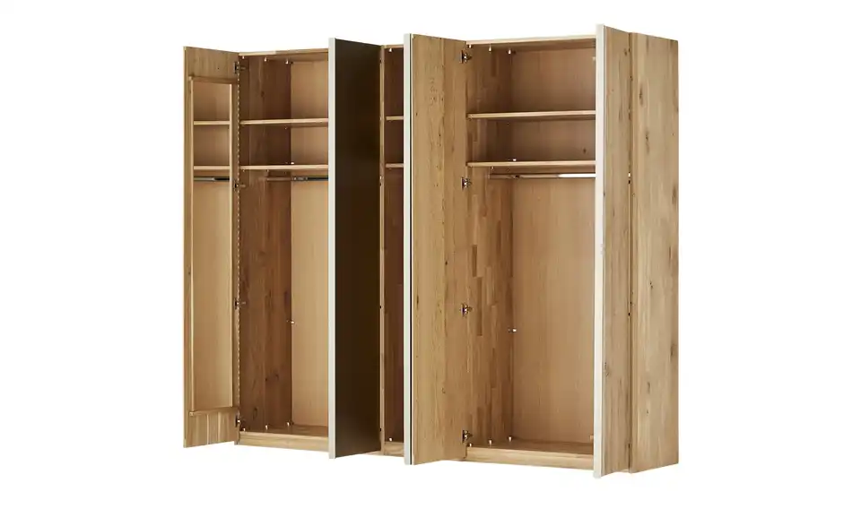Natürliches Holz und cooler Metallic-Look vereinen sich im Schrank Kaja. Korpus und Teile der Front sind aus massiver Wildeiche Natur gefertigt. Die drei mittigen Türen bestehen aus Parsolglas und haben ein extravagantes Design in Silberbronzeoptik. Ein toller Effekt, der den Schrank zum Eyecatcher macht. Hinter den fünf Türen mit Soft-Close unterteilt sich der Schrank in drei Elemente. Je Element können Sie zwei Einlegeböden und eine Kleiderstange nutzen. Die Böden sind höhenvariabel und können deshalb nach Bedarf verstellt werden.Lieferung & Versand