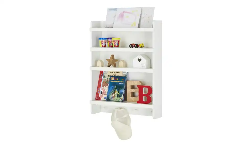 Dieses Wandregal ist in zeitlosem Weiß gehalten und passt dadurch in verschiedene Raumkonzepte. Ob im Kinder-, Jugend-, Arbeits-, oder Wohnzimmer: Das Regal mit den vier offenen Fächern und den vier Haken ist vielseitig einsetzbar.Lieferung & Versand