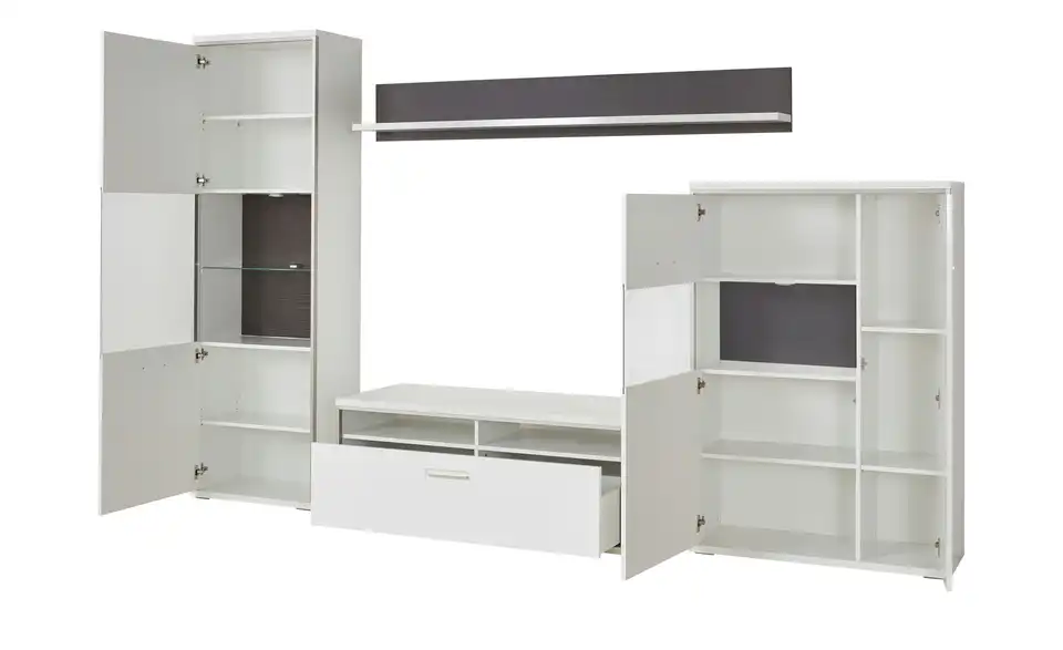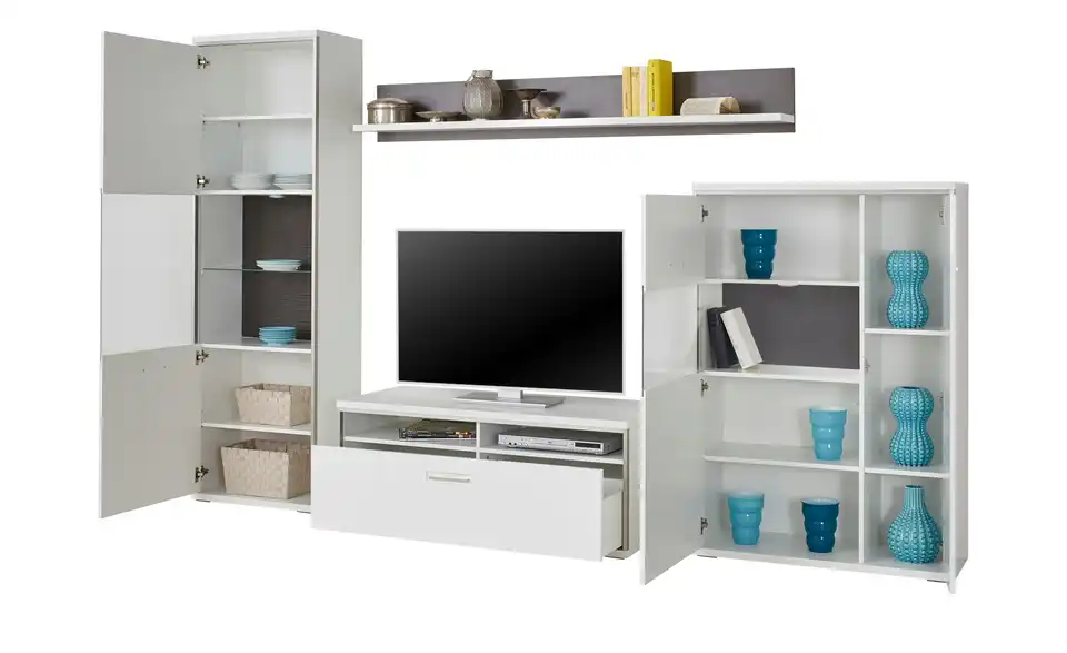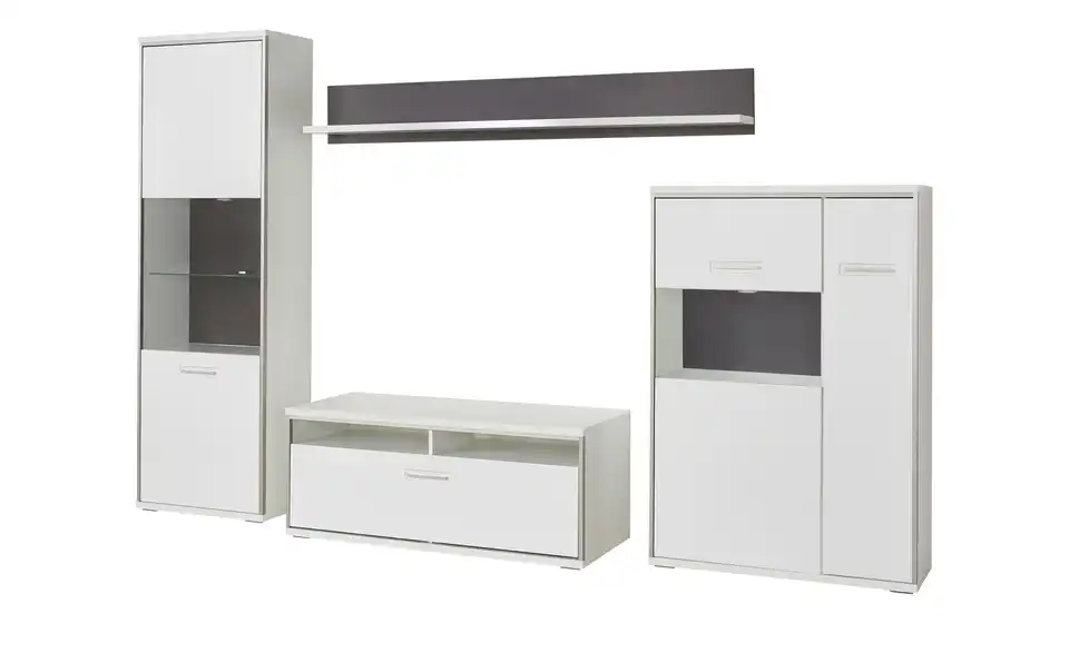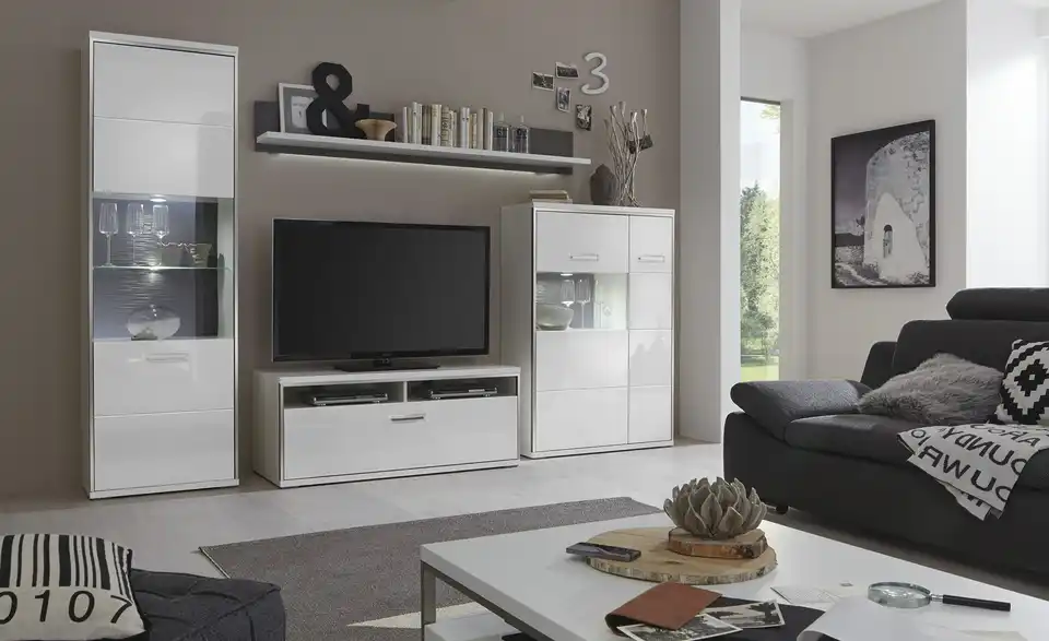 Klare Farben und klare Formen machen den Look der Wohnwand Setto von uno aus. Korpus und Front sind weiß. Die Front hat zusätzlich ein modernes Hochglanzfinish. Ein schmaler Metallrahmen rahmt alle Elemente der Wohnwand ein. Setto besteht aus einer Vitrine, einem Highboard, einem TV-Unterteil und dem passenden Wandboard. Da die Elemente nicht miteinander verbunden sind, können Sie sie flexibel im Raum platzieren. Ein weiteres Highlight: Alle sichtbaren Vitrinenrückwände sind grau – und haben eine auffällige geriffelte Optik. Neben Platz für hübsche Dekoartikel bietet Setto selbstverständlich auch viel Stauraum.Lieferung & Versand