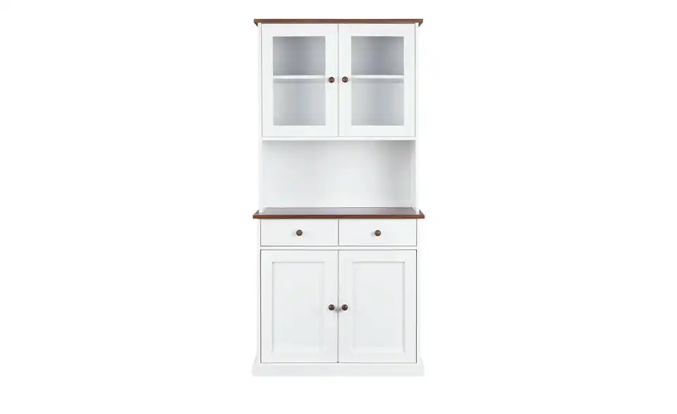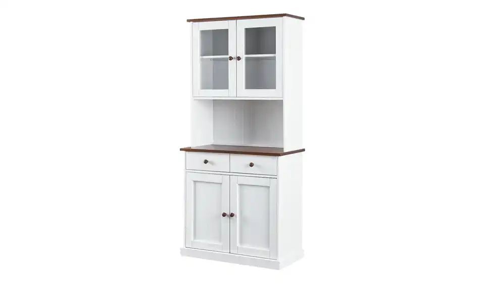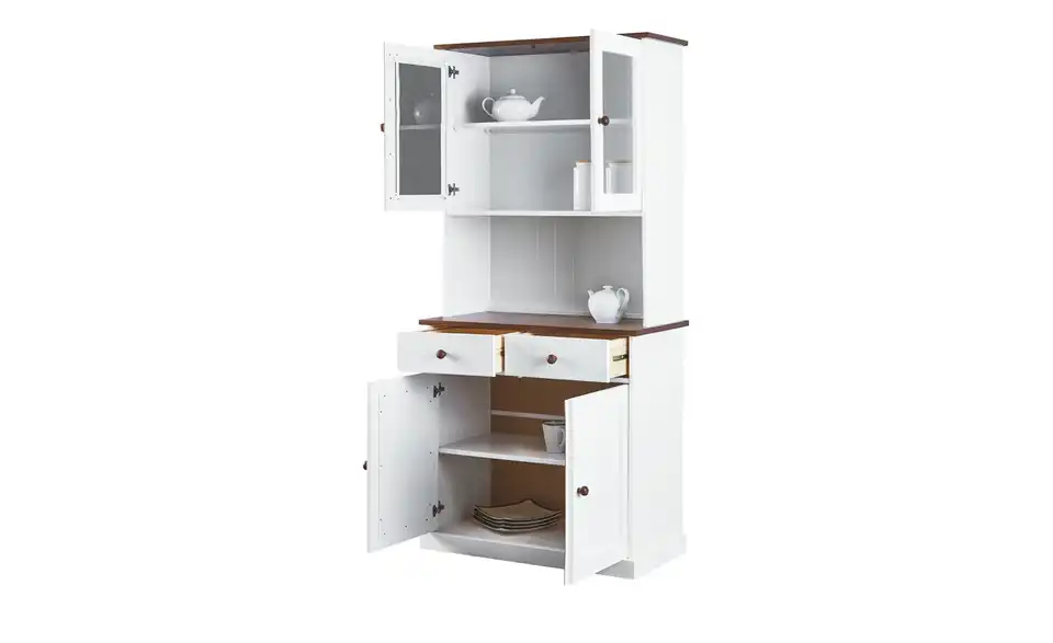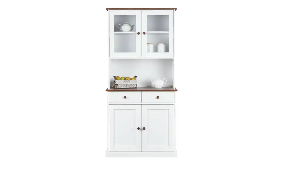 Das Buffet Muslone ist eine nostalgische Bereicherung für Wohnküche oder Esszimmer. Muslone ist im Landhausstil designt. Das Buffet ist aus massivem Kiefernholz gefertigt, seine Oberfläche ist hochwertig lackiert. Im oberen Bereich gibt es zwei Türen mit Glaseinsatz. Dahinter können Sie hübsches Geschirr präsentieren. Im unteren Bereich stehen Ihnen zwei Schubladen und Platz hinter zwei Türen zur Verfügung.Lieferung & Versand
