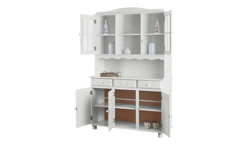 Buffets feiern ein Comeback. Nicht ohne Grund: Sie machen sich wunderbar im Essbereich oder in der Wohnküche. Vor allem, wenn Sie im Landhausstil designt sind wie das Buffet Tivoli. Das Buffet ist aus massivem Kiefernholz gefertigt und mit Klarglas abgesetzt. Die Oberflächen sind weiß lackiert, um das Holz zu schützen und passend zum Landhauslook zu gestalten. Tivoli besteht aus zwei Teilen: einer Kommode und dem passenden Aufsatz. Im Aufsatz befinden sich vier Vitrinenfächer, in die Sie durch die Glastüren schauen können. Mittig sind zwei offene Fächer zu finden. Der untere Teil des Buffets unterteilt sich in drei Schubladen und sechs Fächer hinter drei Türen. Der Platz zwischen Aufsatz und Kommode lässt sich auch praktisch nutzen.Lieferung & Versand
