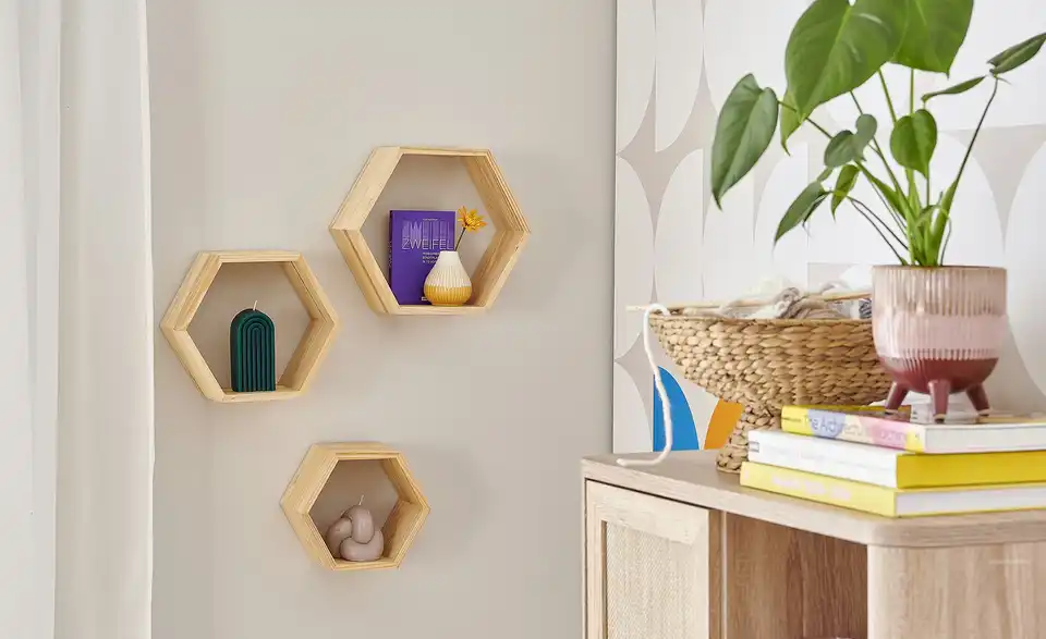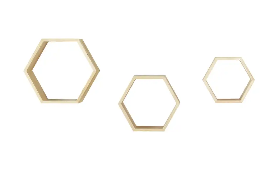 Die Wabenform macht das Regalset Finate zu einem besonderen Eyecatcher. Das Set besteht aus drei Regalen in drei unterschiedlichen Größen. Sie können einzeln, aber auch zusammen aufgehängt werden. Alle drei bestehen aus massiver Pinie.Lieferung & Versand