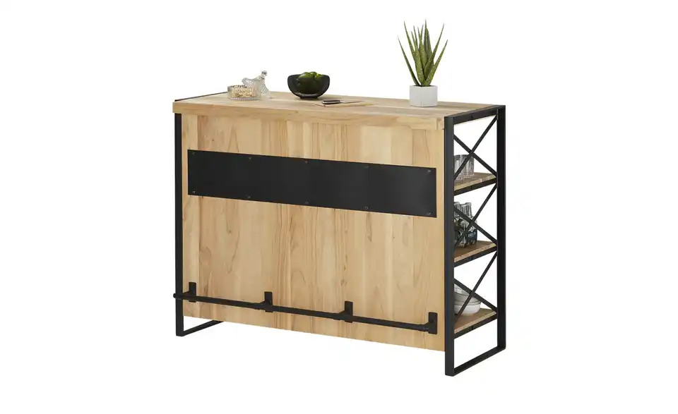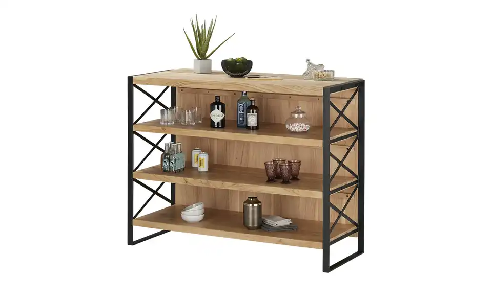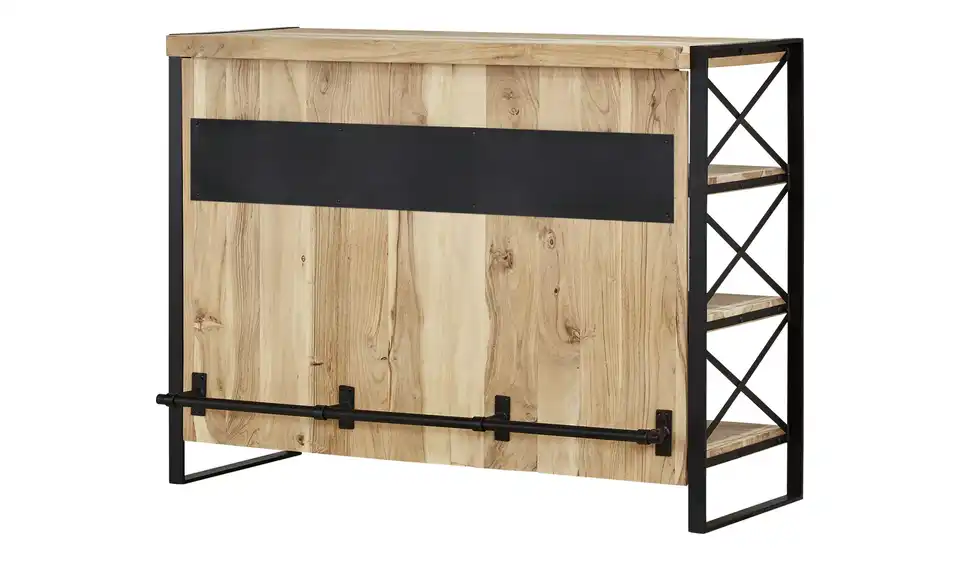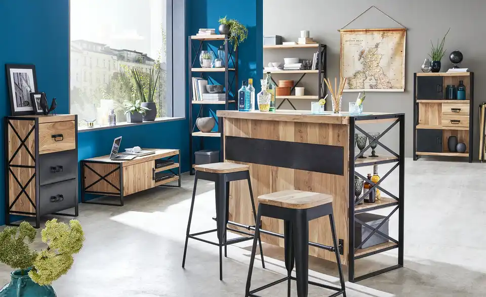 Eine Bar im Wohnzimmer ist schon etwas ganz besonderes. Und wenn sie dann auch noch im Industrial-Look daherkommt, dann sind Ihnen neidische Blicke garantiert. Wie zum Beispiel mit der Bar Queens und ihrem Materialmix. Die Holzflächen bestehen aus massiver Akazie. Sie ist stabil, langlebig und verfügt über eine rustikale Maserung mit Farbunterschieden und Asteinschlüssen. Das Holz ist gebeizt und lackiert. Hinzu kommen Seiten und Akzente aus schwarzem Metall. Sie setzen sich vom hellen Holz ab und zaubern den besonderen Industrie-Charme. Queens verfügt über drei große offene Fächer. Die Abdeckplatte dient als Tresen.Lieferung & Versand