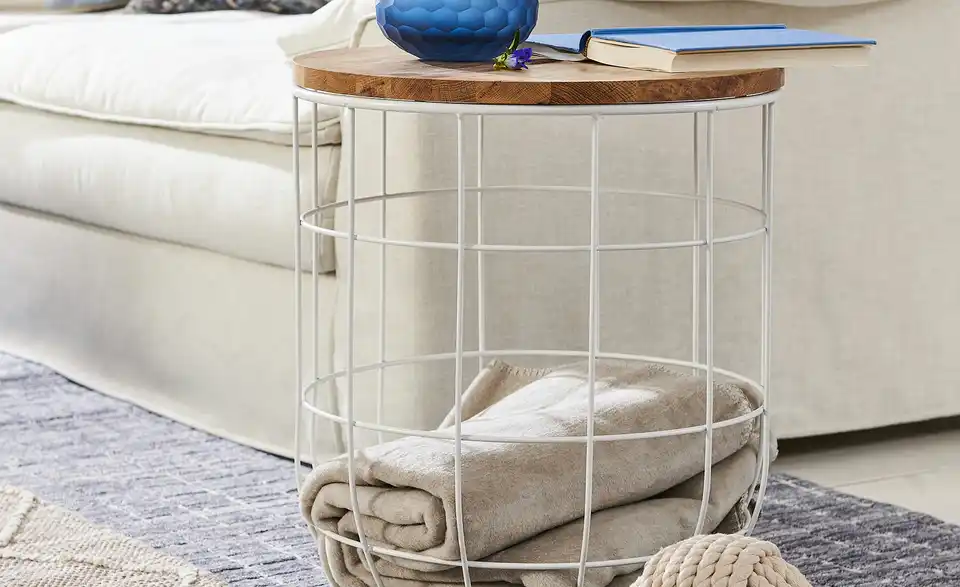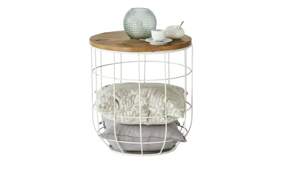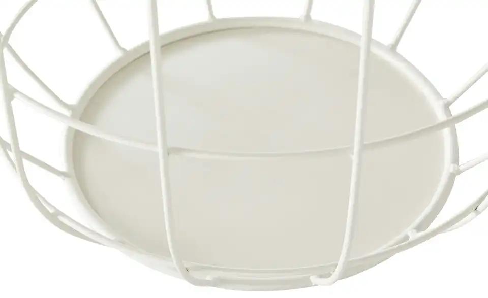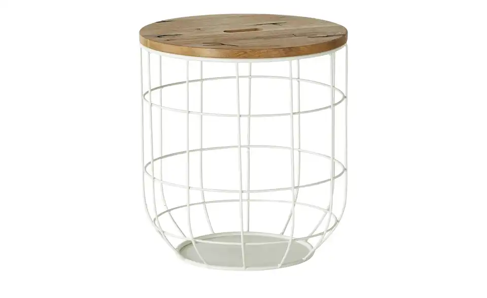 Der Beistelltisch Corbello ist im Factory-Stil designt. Die runde Holztischplatte wird von einem Metallkorb getragen. Er ist pulverbeschichtet und hat einen stylischen, luftigen Look in Weiß. Ein toller Kontrast zur Tischplatte, die aus massiver Eiche gefertigt ist. Sie ist abnehmbar, so dass der Korb darunter als Stauraum genutzt werden kann.Lieferung & Versand