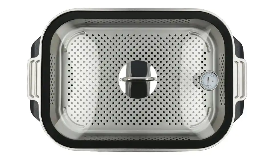- Wärmebeständiger Sichtglasdeckel mit Silikondichtung und herausnehmbarem Thermometer, backofenfest bis 180° C