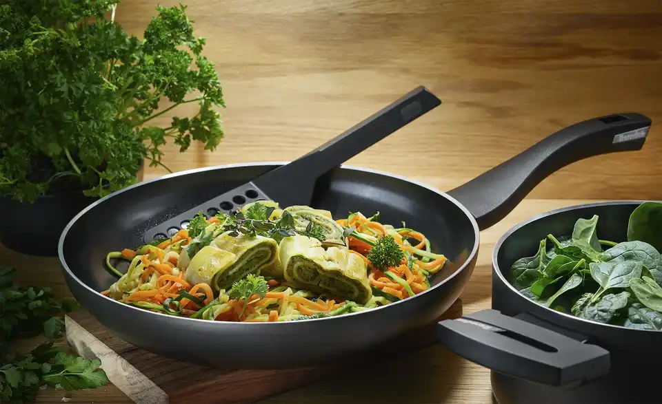 Seit mehr als 100 Jahren steht die Marke Berndes für hochwertiges Kochgeschirr, das den Alltag erleichtert. Die nachhaltige Produktlinie b.green umfasst Pfannen, Töpfe und Backformen, die aus 100% recycelten Aluminium-Dosen hergestellt sind. Da diese in der Verarbeitung 95% weniger Energie benötigen als neues Aluminium, werden so 95% CO2 gespart. Dadurch fördert b.green nicht nur die Kreislaufwirtschaft, sondern trägt auch zu einer Verringerung des ökologischen Fußabdrucks bei.