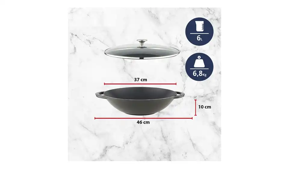 Zaubern Sie leckere asiatische Gerichte. Mit diesem Wok geht das viel einfacher. Der Wok ist aus Gusseisen gefertigt. Die Oberfläche ist emailliert. Ein passender Glasdeckel ist im Lieferumfang enthalten. Den mitgelieferten Gitterrost können Sie oben auf den Wok legen. Er bietet Platz für Stäbchen.Lieferung & Versand