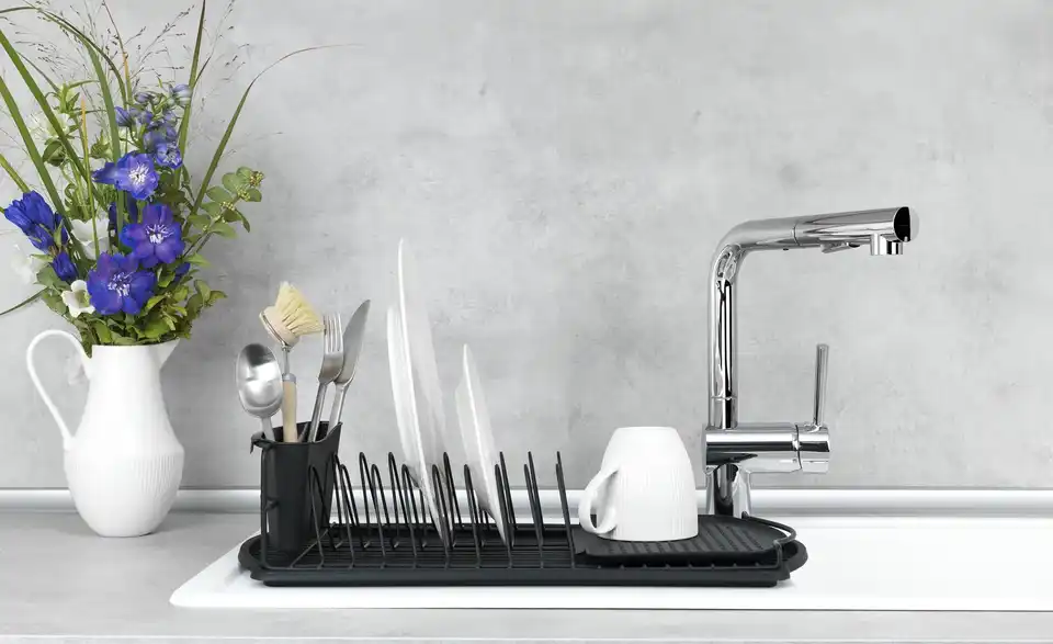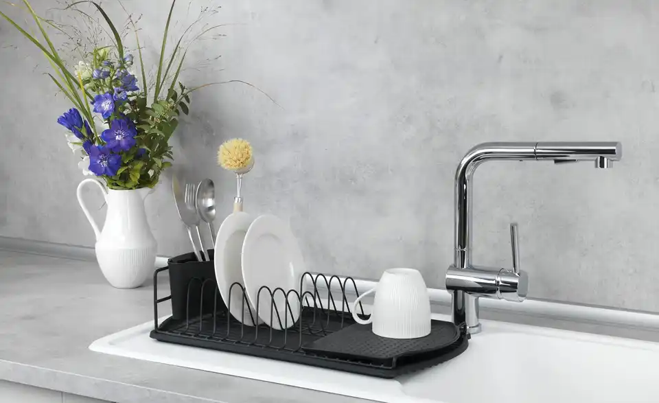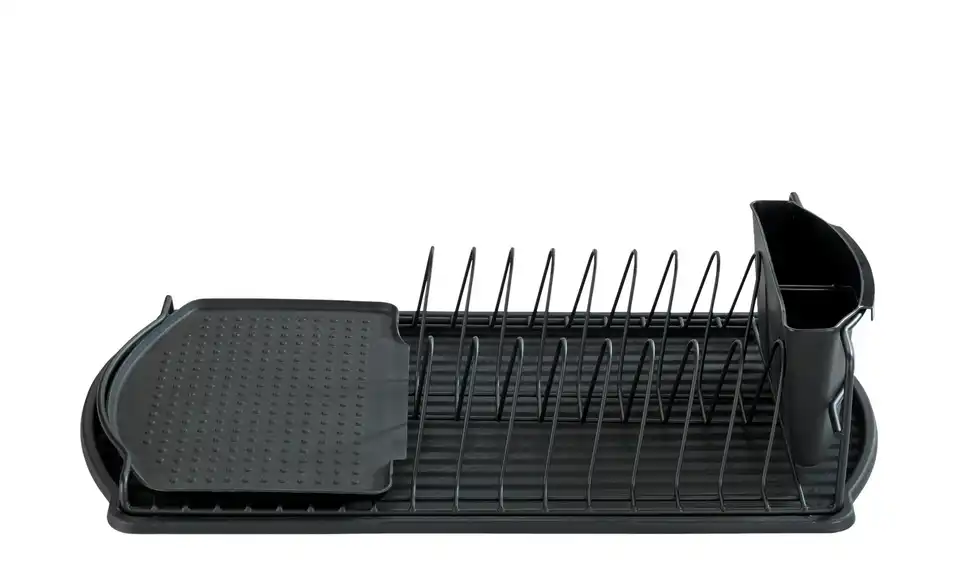 Ein hochwertiger und praktischer Küchenhelfer ist der Geschirrabtropfer Basic von Wenko. Das Abtropfgestell in Schwarz bietet Platz für Geschirr, Gläser und Besteck, die nach dem Spülen einfach trocknen können. Dank seiner kompakten Form ist er auch für kleinere Küchen geeignet. Der Abtropfständer ist mit einer Abtropfschale ausgestattet, die abnehmbar ist, sich leicht reinigen lässt und außerdem für eine trockene Arbeitsfläche sorgt. Die Abtropfmatte lässt sich zudem auch separat verwenden. Ausgestattet mit einem Tellerhalter, einem abnehmbaren Besteckkorb und viel Platz für Schüsseln und Gläser ist der Ständer der ideale Helfer beim Spülen. Er besteht aus einem hochwertigen Gestell aus pulverbeschichtetem Metall und schwarzen Kunststoffteilen, das macht ihn langlebig und robust. Neben den praktischen Funktionen ist der Abtropfer in Schwarz ein edler Blickfang in der Küche und passt perfekt in einen modernen Einrichtungsstil.Lieferung & Versand