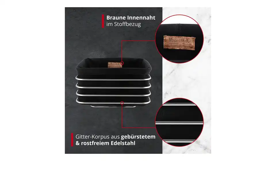Dieser edle Brotkorb schmückt jeden Frühstückstisch. Der Korb besteht aus einem Korb aus gebürstetem, rostfreiem Edelstahl ausgeschlagen mit schwarzem Stoff - formschön im Meisterkoch-Design. Der Stoff ist entnehmbar und einzeln waschbar, stylisch und praktisch in Einem. Außerdem kann der Korb ohne Stoff-Inlay als Obstkorb verwendet werden.Lieferung & Versand