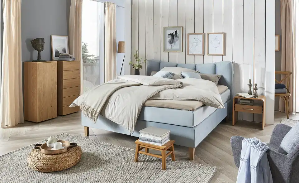 Dicke, weiche Polster laden zum Entspannen ein: Beim Boxspringbett Dalur wirkt das längs gesteppte, geschwungene Kopfteil gemütlich und einladend. Zusammen mit den lackierten Füßen aus massivem Eichenholz bekommt das Bett einen attraktiven Scandi-Touch. Durch die Kombination aus Tonnentaschenfederkern, Bonnellfederkern und dem viscoelastischen Kern wird das Boxspringbett Dalur auch höchsten Komfort-Ansprüchen gerecht. Um sich Ihrem persönlichen Liegeempfinden noch besser anzupassen, stehen Ihnen verschiedene Matratzen-Härtegrade zur Verfügung. Wählen Sie ganz einfach den passenden Härtegrad für sich und genießen Sie erholsame Nächte. Übrigens: Ein durchgehender Topper mit abnehmbarem Bezug ist im Lieferumfang enthalten. Sie können ihn problemlos bei bis zu 60 °C waschen.Lieferung & Versand
