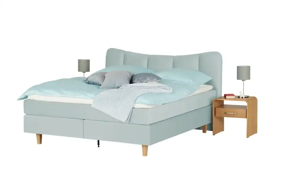 Dicke, weiche Polster laden zum Entspannen ein: Beim Boxspringbett Dalur wirkt das längs gesteppte, geschwungene Kopfteil gemütlich und einladend. Zusammen mit den lackierten Füßen aus massivem Eichenholz bekommt das Bett einen attraktiven Scandi-Touch. Durch die Kombination aus Tonnentaschenfederkern, Bonnellfederkern und dem viscoelastischen Kern wird das Boxspringbett Dalur auch höchsten Komfort-Ansprüchen gerecht. Um sich Ihrem persönlichen Liegeempfinden noch besser anzupassen, stehen Ihnen verschiedene Matratzen-Härtegrade zur Verfügung. Wählen Sie ganz einfach den passenden Härtegrad für sich und genießen Sie erholsame Nächte. Übrigens: Ein durchgehender Topper mit abnehmbarem Bezug ist im Lieferumfang enthalten. Sie können ihn problemlos bei bis zu 60 °C waschen.Lieferung & Versand