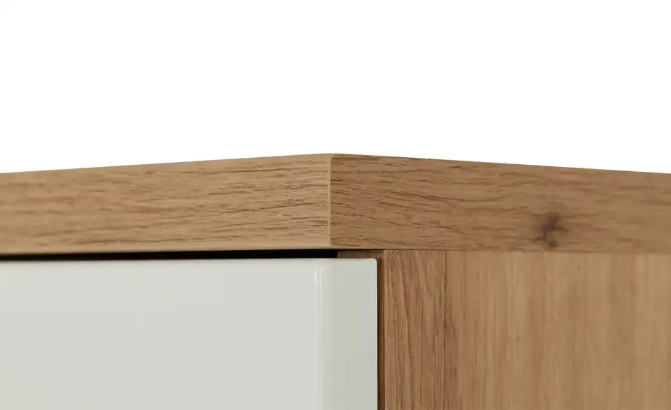 - Mehr zu MaterialKorpus aus Holzwerkstoff melaminbeschichtet in Artisan Eiche (Nachbildung)Front aus Holzwerkstoff beschichtet in Weiß hochglanz / Absetzung in Hirnholz (Nachbildung)Griffe aus Metall in Nickel matt