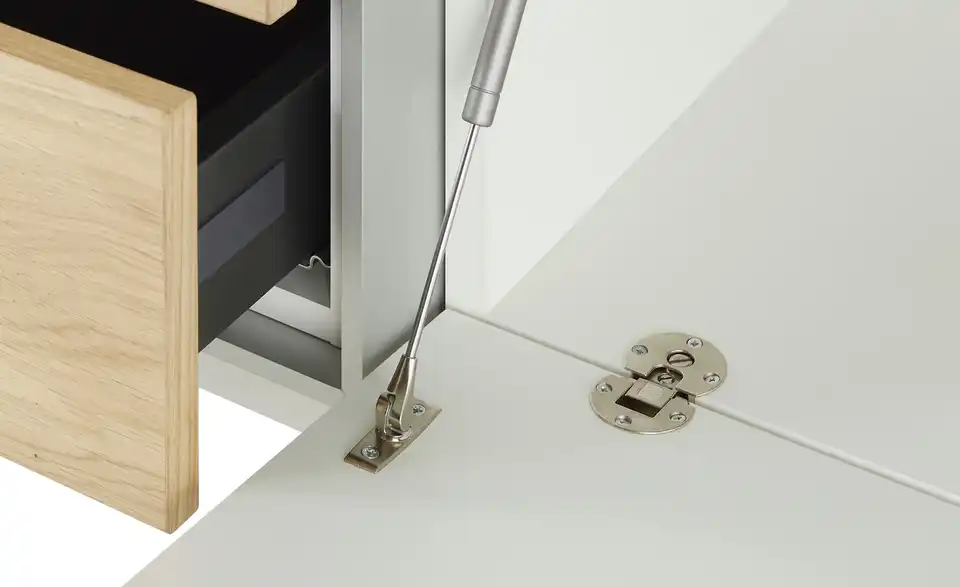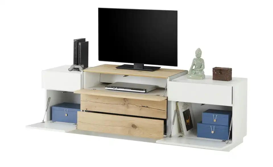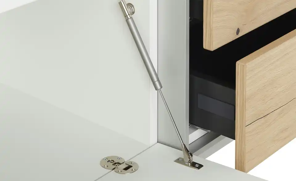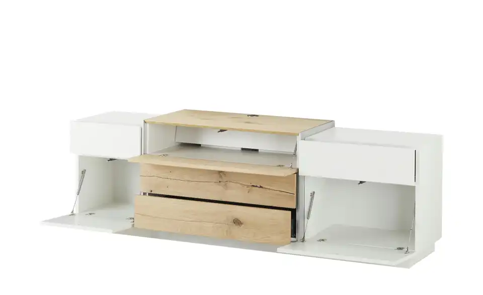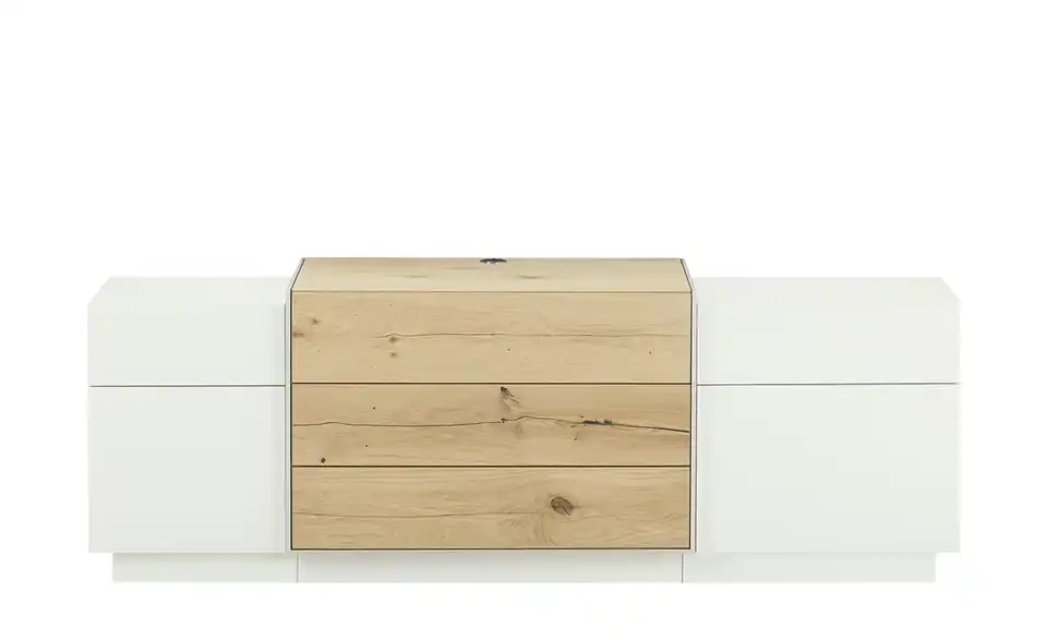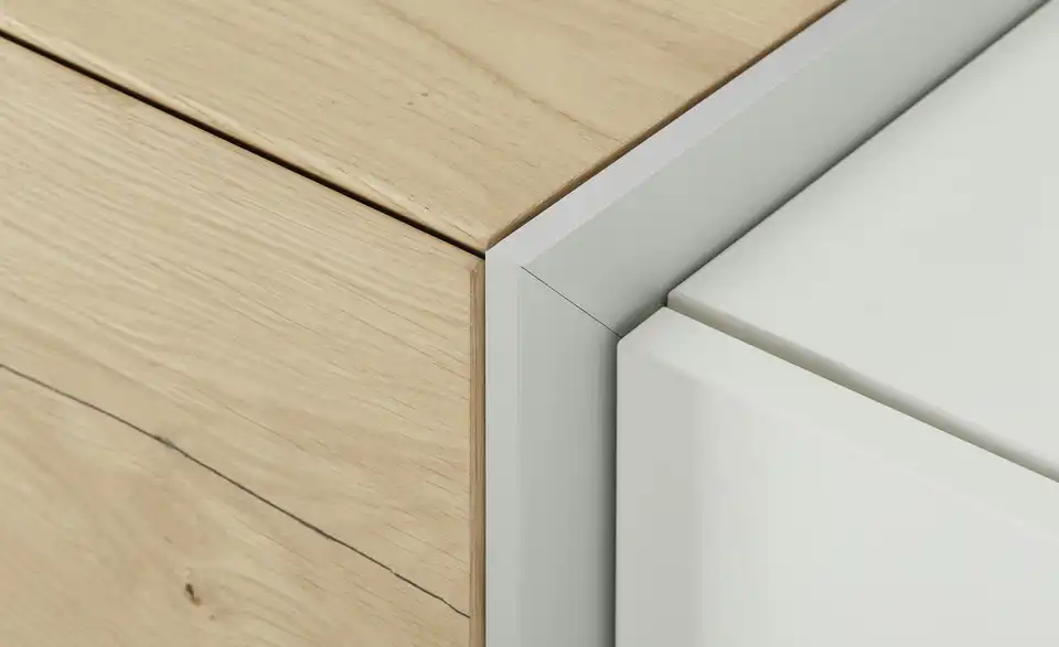 - Mehr zu MaterialMittelteil aus Wildeiche hell furniertSeitenteile aus Holzwerkstoff Polarweiß matt lackiert