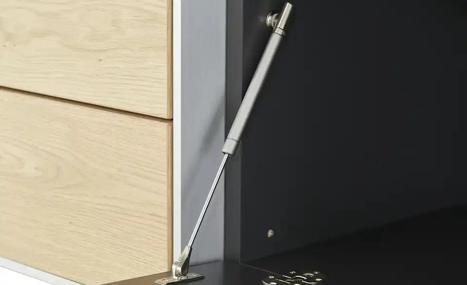 - Mehr zu Ausstattung / FunktionKlappen mit GasdruckdämpferMedienboard mit Designkufe 3 Raster wandhängendMetallkabeldurchlass im Deckblatt