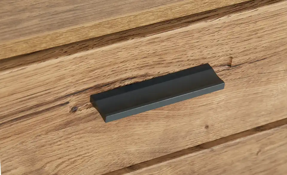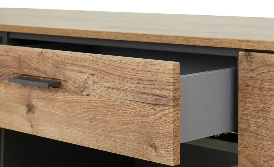 - Mehr zu MaterialKorpus und Front aus Holzwerkstoff foliert in Haveleiche Cognac (Nachbildung) / innen Graphit (Grau)Griffe aus Aluminium in Anthrazit beschichtetFrontverglasung aus Klarglas