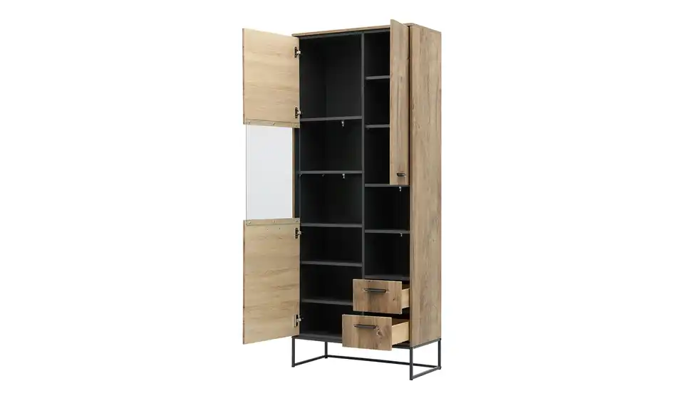 - Mehr zu MaterialKorpus und Front aus Holzwerkstoff foliert in Haveleiche Cognac (Nachbildung) / innen Graphit (Grau)Griffe aus Aluminium in Anthrazit beschichtetFrontverglasung aus Klarglas