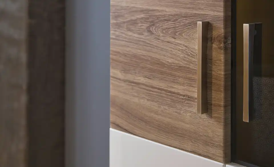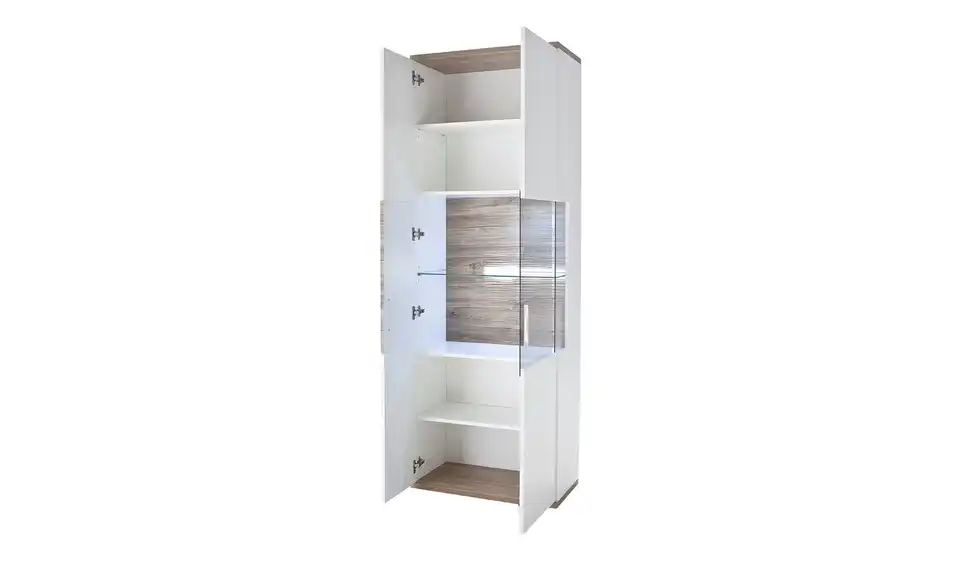 - Mehr zu MaterialFront aus MDF (Mitteldichte Faserplatte) in Weiß hochglanz tiefzieh (Nachbildung) / Absetzung aus MDF in Sterling Oak tiefzieh (Nachbildung)Korpus aus DBS (Direktbeschichtete Spanplatte) in Weiß matt Melamin (Nachbildung) / Absetzung aus DBS in Sterling Oak (Nachbildung)Front- und Seitenverglasung aus ESG (Einscheibensicherheitsglas) in Parsol Grausichtbare Rückwand aus Kunststoff in 3D-Optik Sterling Oak tiefzieh (Nachbildung)