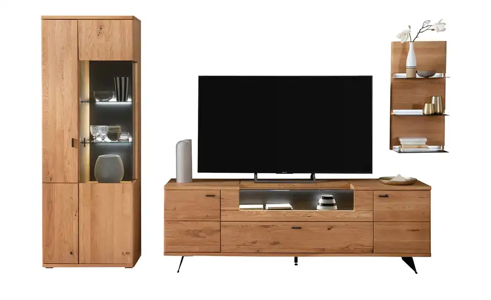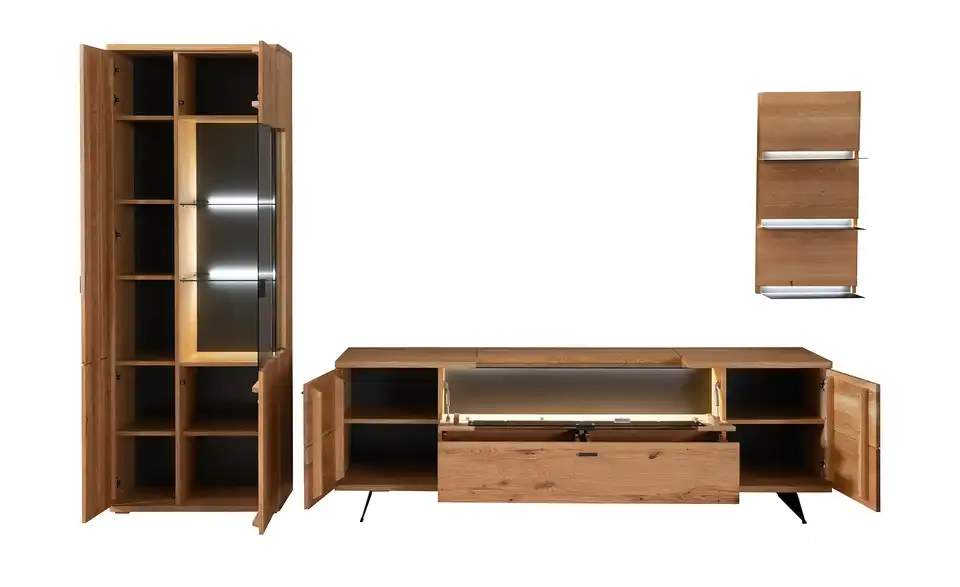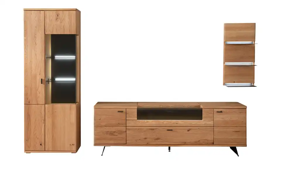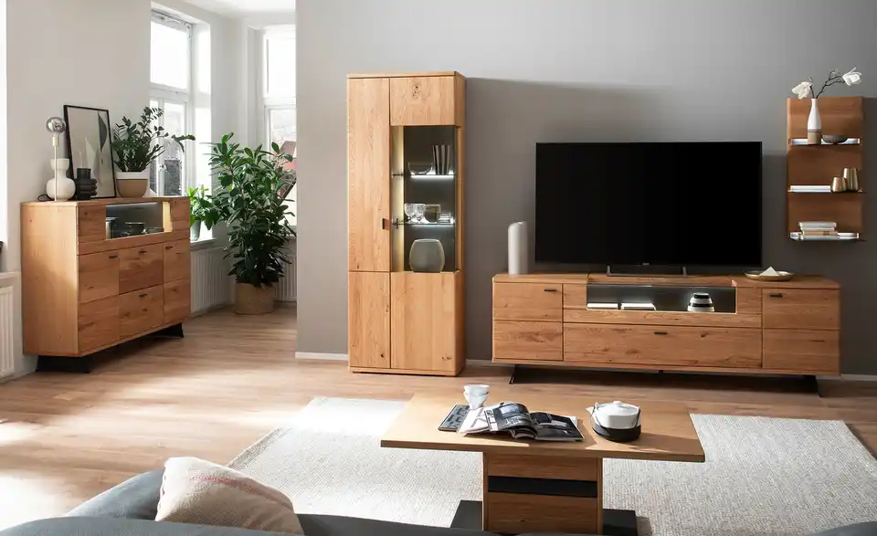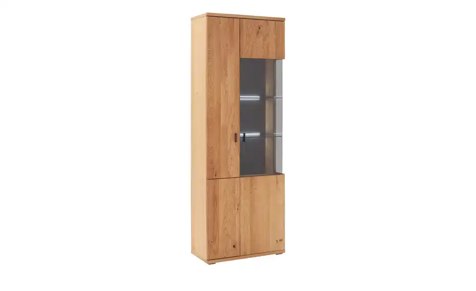 - Mehr zu MaterialFront aus Massivholz in Wildeiche geöltKorpus aus Holzwerkstoff furniert in Wildeiche geölt / innen Holzwerkstoff beschichtet in Wildeiche (Nachbildung)Sichtbare Rückwand und Rückwand hinter Türen und Schubkasten aus Holzwerkstoff beschichtet in DunkelgrauFront- und Korpusverglasung aus ESG (Einscheibensicherheitsglas) in Parsol Grau / Glasböden aus Klarglas