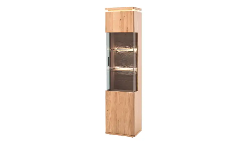 - Mehr zu MaterialFront aus Massivholz in Balkeneiche Bianco geöltKorpus aus Holzwerkstoff furniert in Eiche Bianco geölt / innen Eiche Bianco (Nachbildung)Front- und Seitenverglasung aus ESG (Einscheibensicherheitsglas) in Parsol (Grau) / Glasböden in Klarglassichtbare Rückwände in 3D Balkeneiche (Nachbildung) geschroppt
