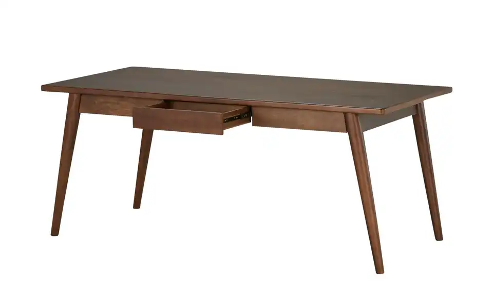 Die Serie Tweed Me entführt Sie in längst vergangene Zeiten und bringt Wiener Eleganz in Ihre vier Wände. So auch der Esstisch aus dunklem, schön gemasertem Mango-Massivholz. Die vier konischen, schräg zulaufenden Massivholzfüße tragen die 180 x 90 cm große Tischplatte zuverlässig und versprühen dabei einen einzigartigen Charme. Unter der Tischplatte befindet sich auf jeder der langen Seiten ein praktisches Schubfach. Hier können Sie Servietten oder kleine Besteckkästen unterbringen.Lieferung & Versand