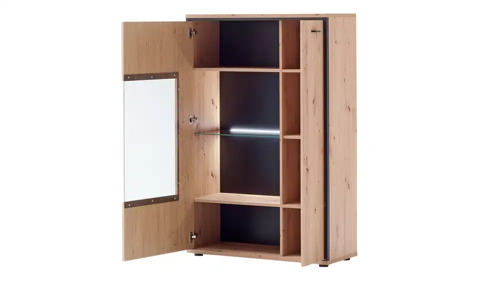 - Mehr zu MaterialKorpus aus Holzwerkstoff melaminbeschichtet in Balkeneiche (Nachbildung) / Absetzung aus Metall in AnthrazitFront aus Holzwerkstoff tiefgezogen in Balkeneiche (Nachbildung)Frontverglasung aus ESG (Einscheibensicherheitsglas) in Parsol Grau / Glaseinlegeböden aus klarem FloatglasSichtbare Rückwand aus Holzwerkstoff beschichtet in Anthrazit