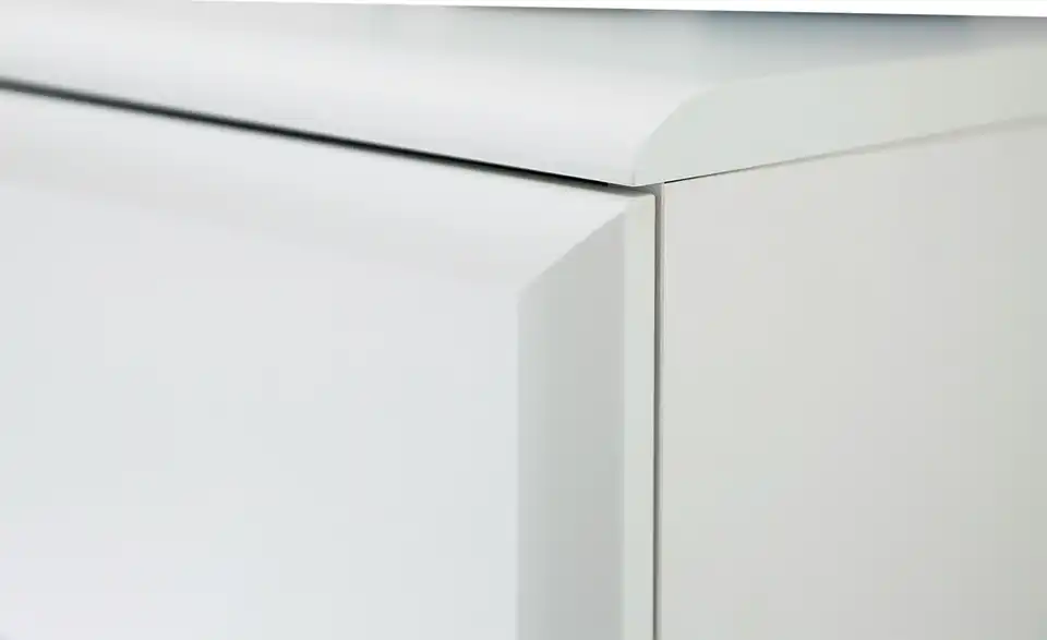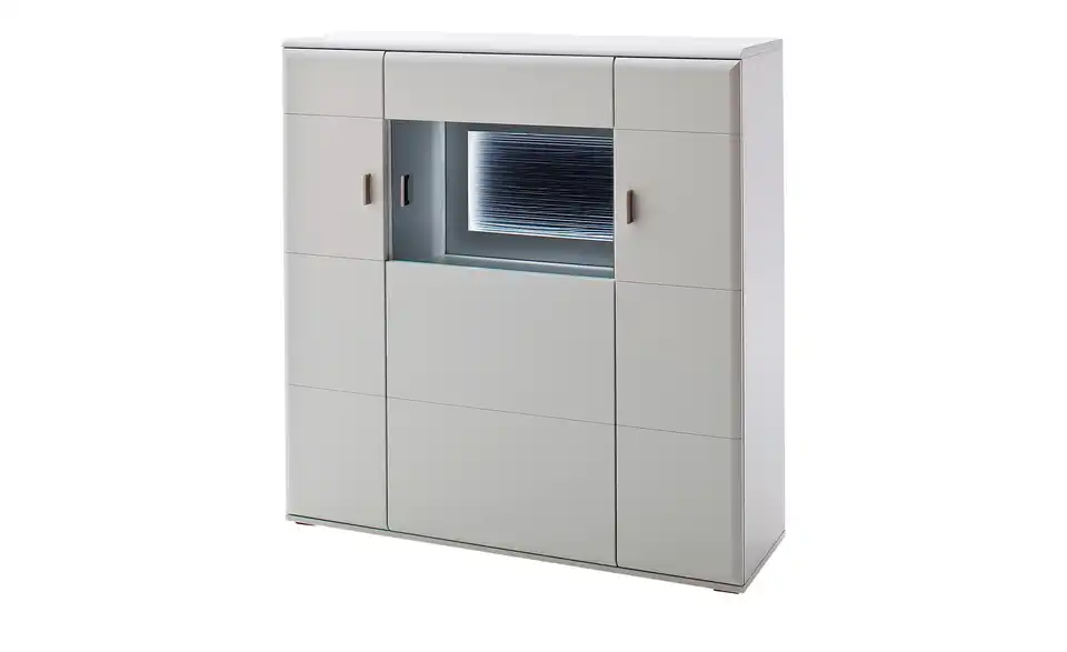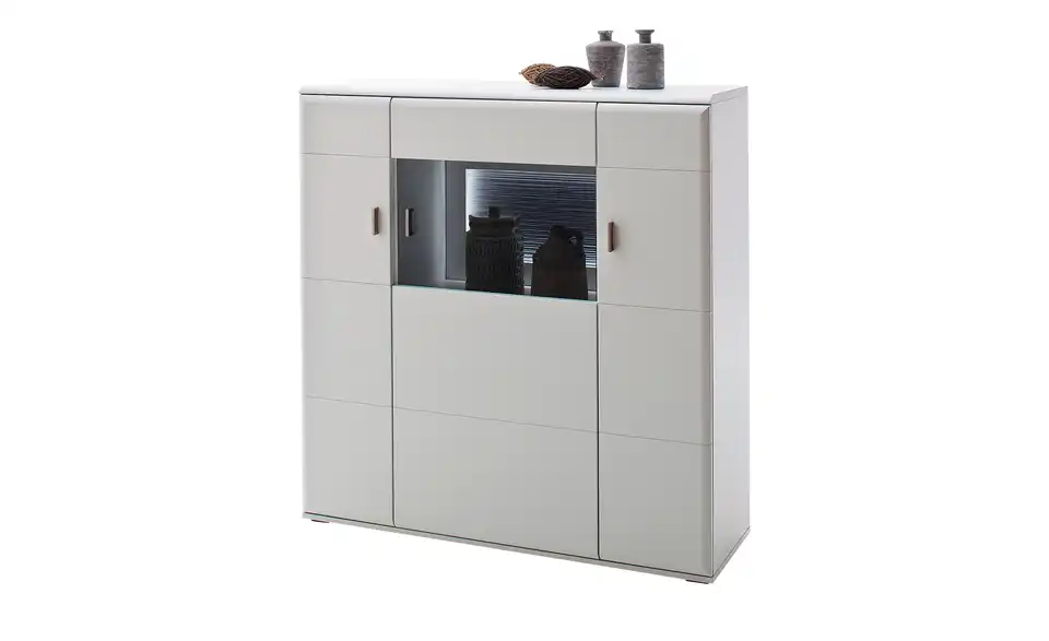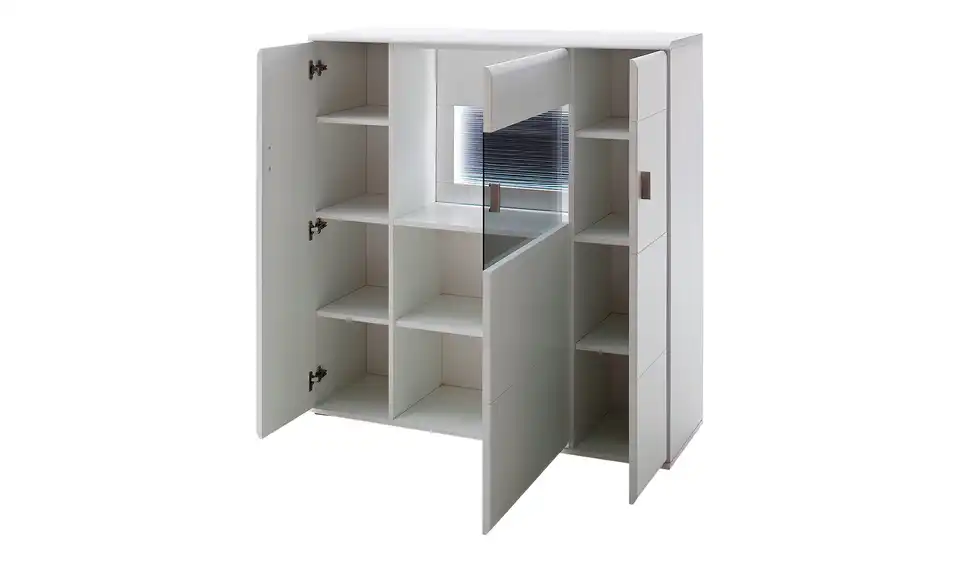 Mattweiße Fronten, ein gradliniges Design und moderne Metallgriffe machen das Highboard Ramon zeitlos und kombinationsfreudig. Die Fronten sind mit kratzerunempfindlichem Melamin beschichtet und besitzen abgerundete Ecken. Mittig wird die blickdichte Front durch ein Vitrinenfenster unterbrochen. Hier können Sie Vasen und andere Lieblingsobjekte gekonnt in Szene setzen. Blickdichter Stauraum steht Ihnen außerdem in insgesamt zehn Fächern zur Verfügung. Unser Tipp: Unter Zubehör finden Sie die passende LED-Rückwandbeleuchtung für den Vitrinenteil. So wird das Vitrinenfach zur Bühne für Ihre Lieblings-Dekoration.Lieferung & Versand