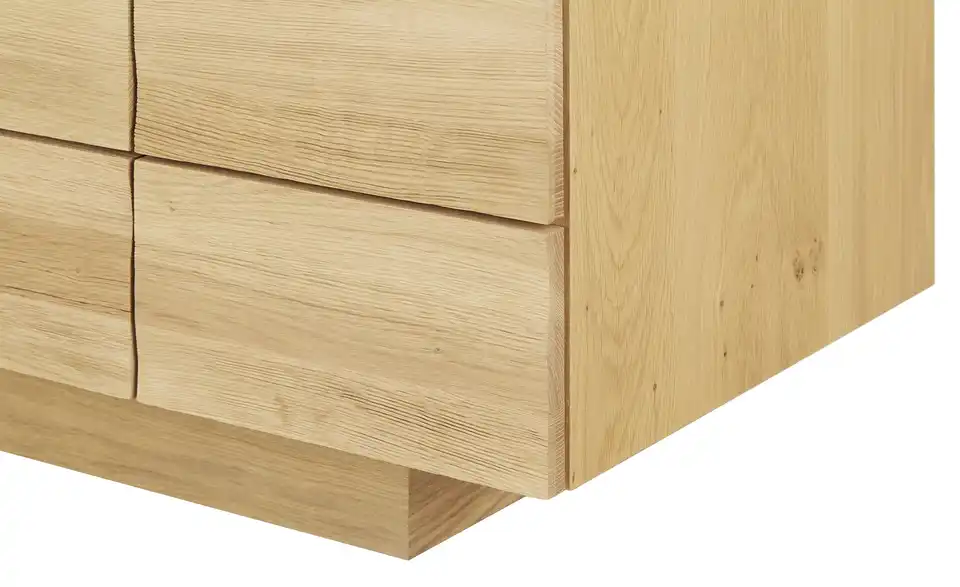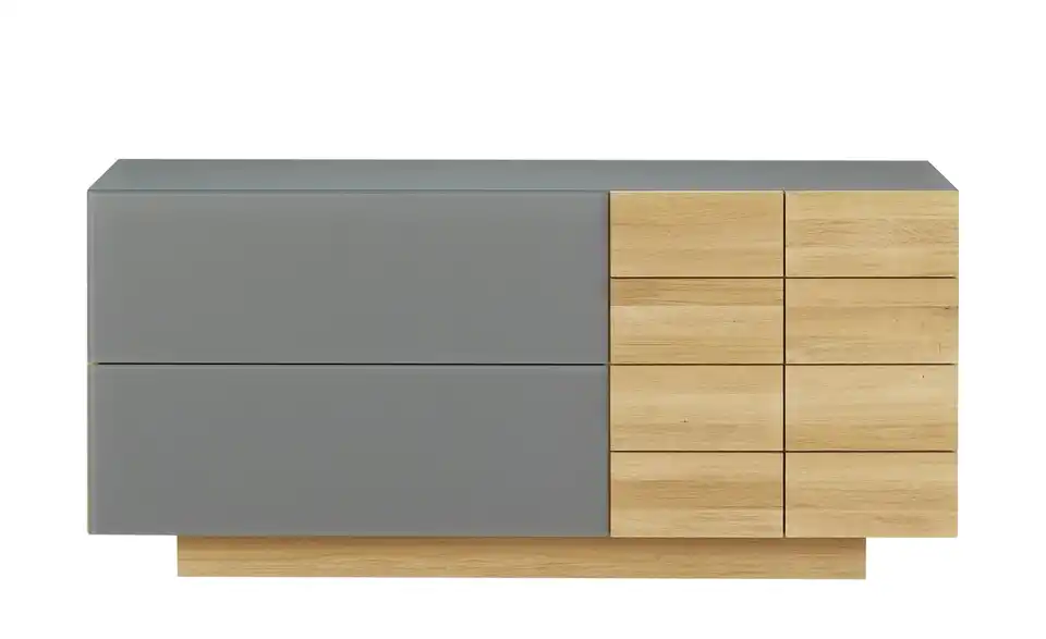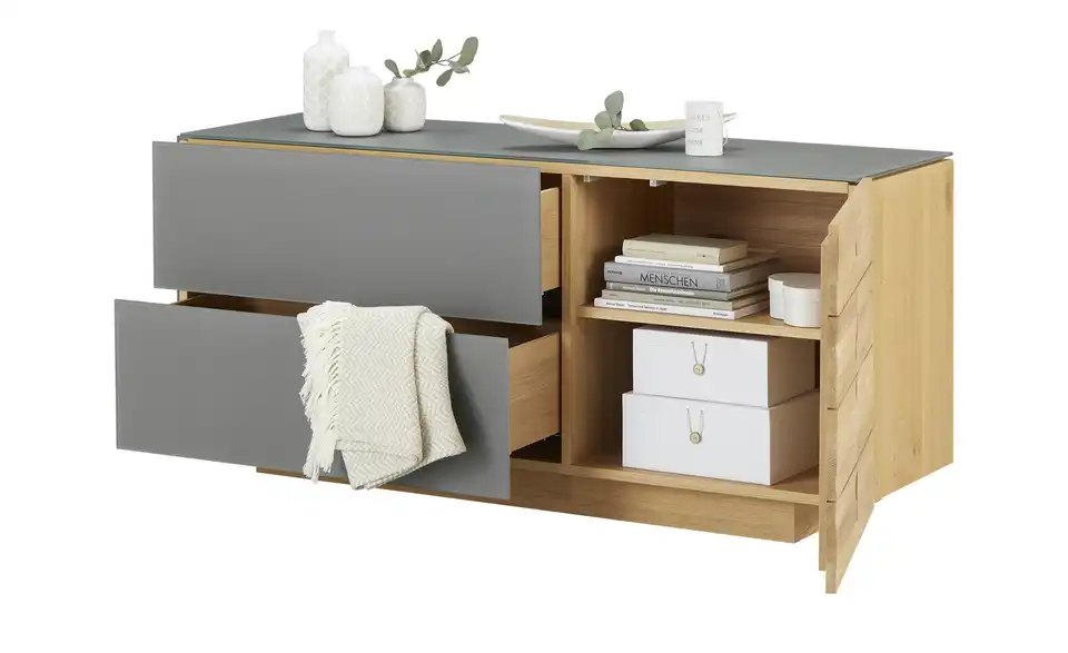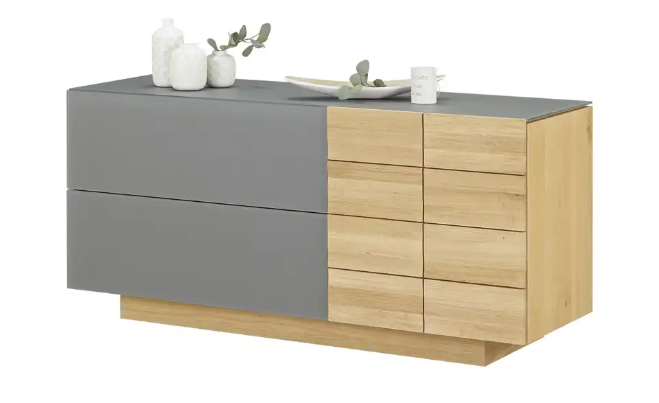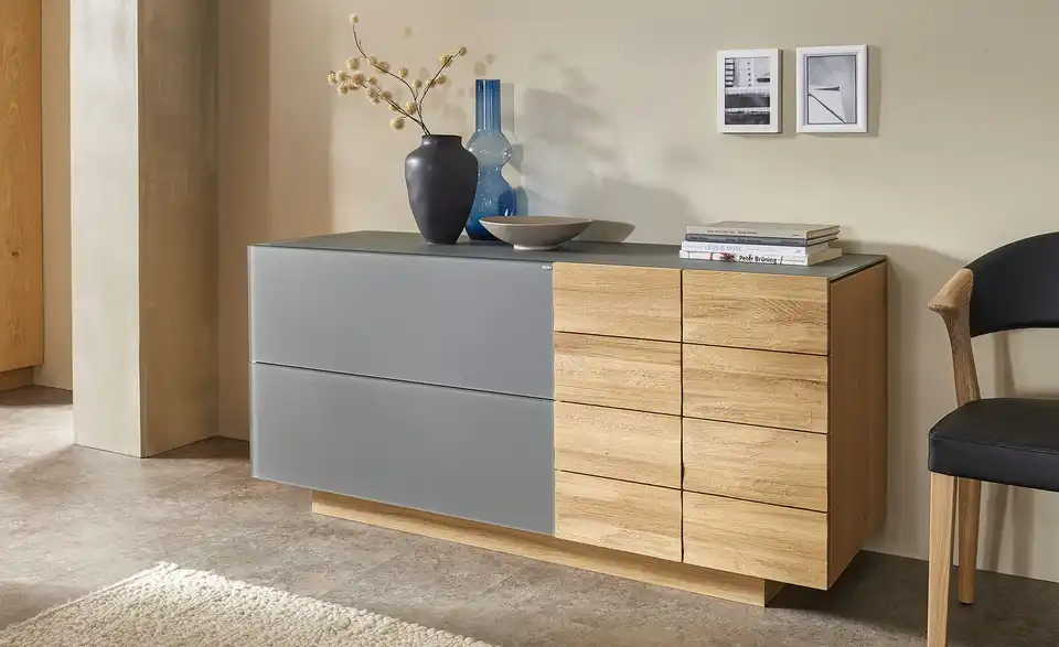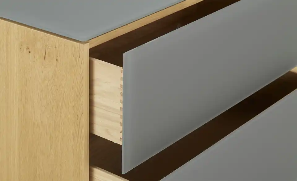 - Mehr zu MaterialKorpus aus Tischlerplatte furniert in Wildeiche geöltFront aus Massivholz Wildeiche geöltFront-Absetzung und Oberboden aus Colorglas satiniert in Montegrau
