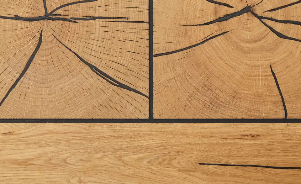 - AusführungApplikationen aus massivem Hirnholz mit Schwarz verfüllten Rissen