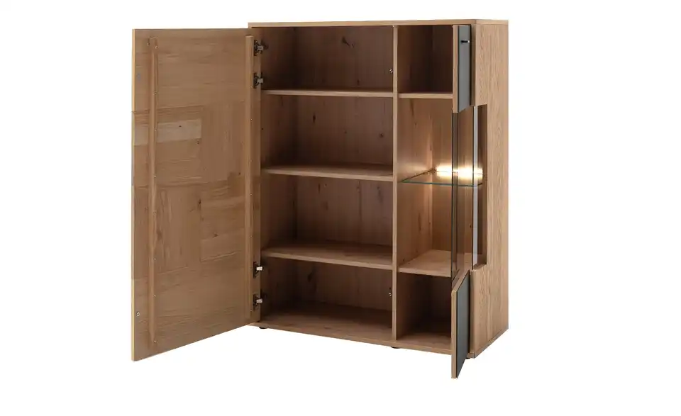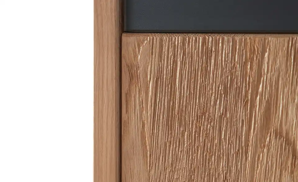 - Mehr zu MaterialFront aus Glas Anthrazit satiniert, dahinter Holzwerkstoff furniert in Eiche Bianco geöltFrontabsetzung aus Massivholz in Balkeneiche Bianco strukturiert sandgestrahlt und lackiertKorpus aus Holzwerkstoff furniert in Eiche Bianco geölt / innen Eiche Bianco (Nachbildung)Sichtbare Rückwand aus Holzwerkstoff furniert in Eiche Bianco geöltFront- und Seitenverglasung aus ESG (Einscheibensicherheitsglas) in Pasol Grau / Glasboden aus Klarglas