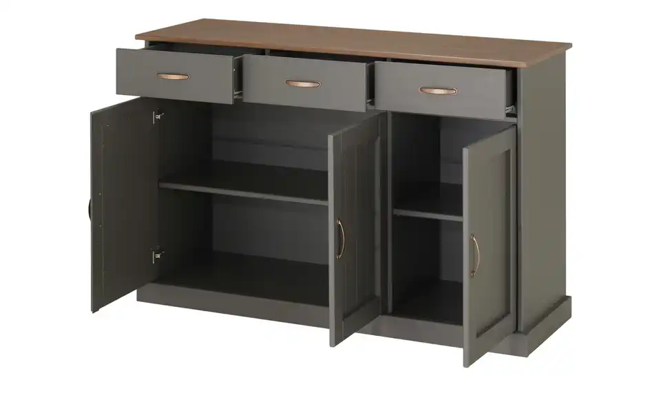 Mit dem Landhausstil können Sie Räume besonders wohnlich und nostalgisch einrichten. Zum Beispiel auch mit dem Sideboard Muslone, das im Landhausstil designt ist. Korpus, Front und Böden sind aus massiver Kiefer gefertigt. Alle Oberflächen sind hochwertig lackiert. Muslone bietet Ihnen neben der Optik natürlich auch Stauraum. Und zwar in drei Schubladen und hinter drei Türen.Lieferung & Versand