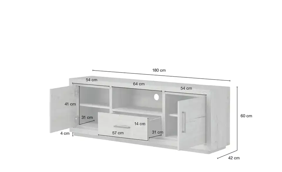 Als Stellplatz für Ihren Fernseher empfehlen wir das TV-Lowboard Black Coast One von Gray & Jones. Es hat eine 180 Zentimeter breite Stellfläche und ein mittiges Gerätefach. In der Rückwand befindet sich ein praktischer Kabeldurchlass. Stauraum ist hinter zwei Türen – eine links, eine rechts – und in der mittigen Schublade zu finden. Türen und Schublade haben eine Soft-Close-Funktion und schließen deshalb geräuscharm. Front und Korpus sind mit Eiche furniert und haben eine attraktive holztypische Maserung.Lieferung & Versand