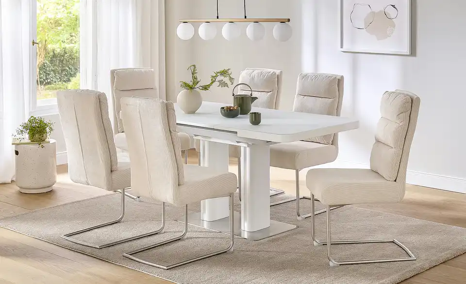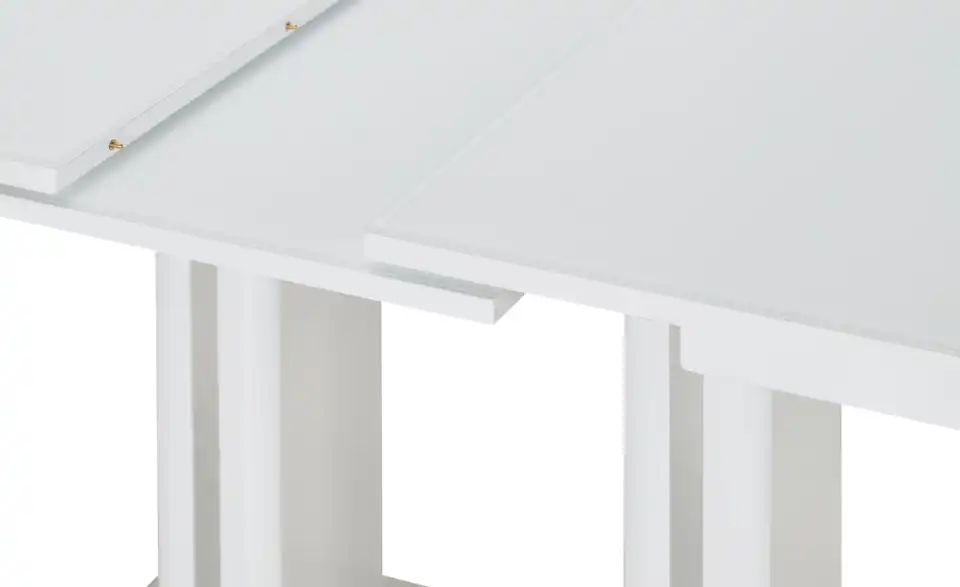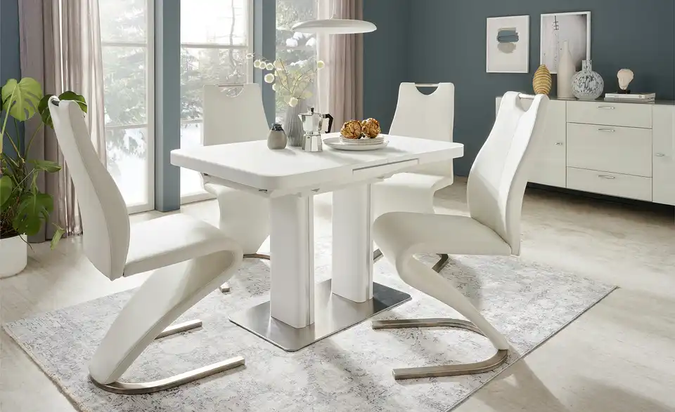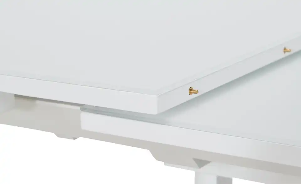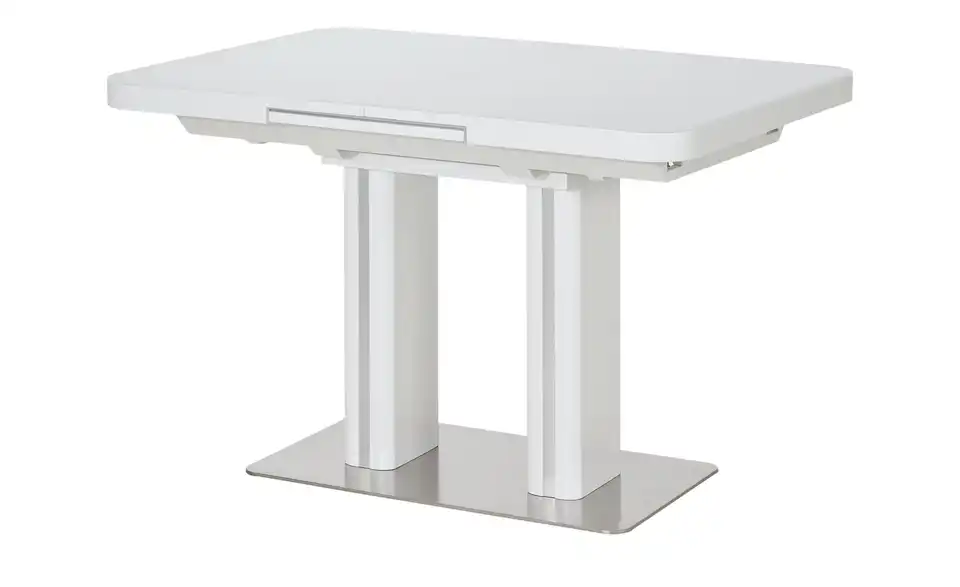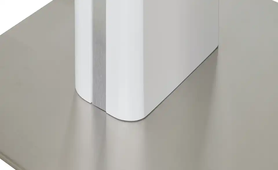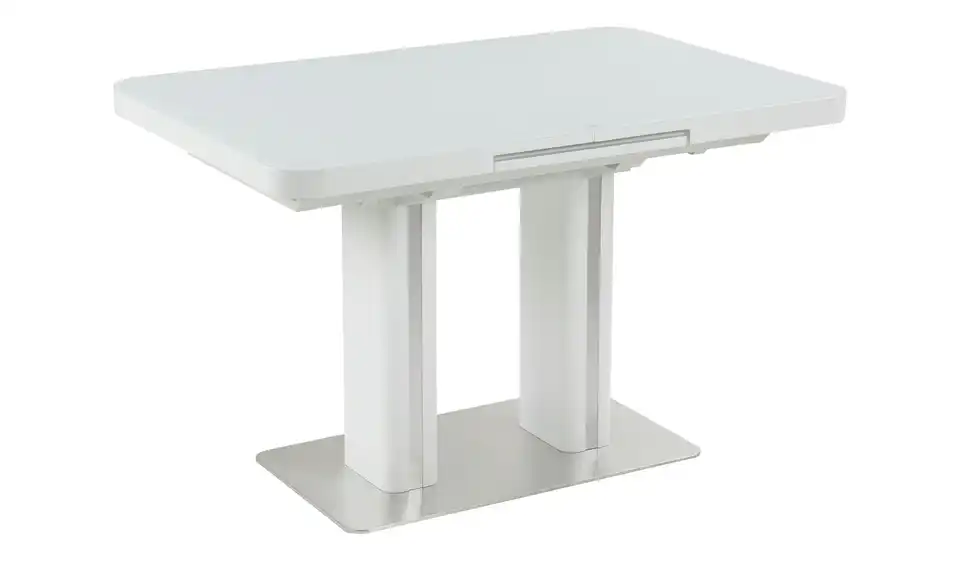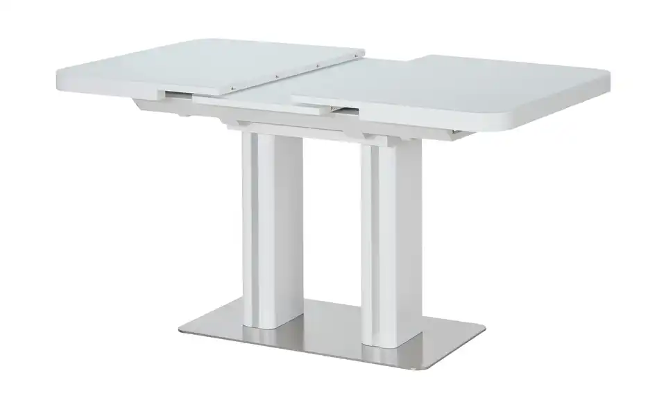 Modern und funktional: Der Esstisch Tizian in Weiß mit dekorativen Elementen in Edelstahl-Optik. Tizian ist ein ausziehbarer Esstisch und lässt sich durch den integrierten Mittelauszug kinderleicht auf 160 Zentimeter erweitern. Bei Bedarf bietet er dann Platz für bis zu acht Personen. Die weiße Tischplatte hat eine Glasoberfläche und lässt sich dadurch besonders einfach abwischen. Die beiden eckigen Säulentischbeine stehen auf einer Bodenplatte aus Edelstahl und sorgen für ein Plus an Stabilität. Tizian verleiht Ihrem Esszimmer ein modernes und leicht futuristisches Aussehen.Lieferung & Versand