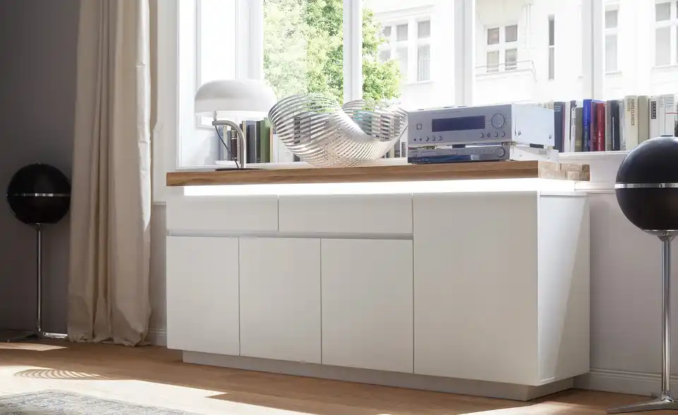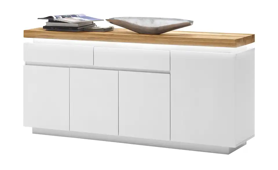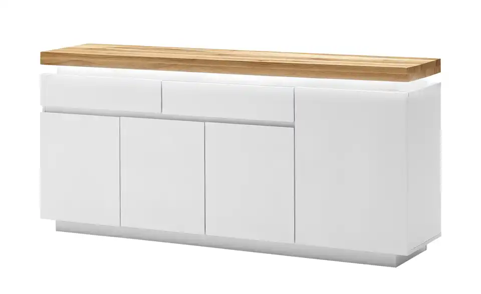 Sie brauchen mehr Stauraum? Dann ist das Sideboard Fornico genau richtig für Sie. Es ist mit vier Türen und zwei Schubladen ausgestattet. Hinter den Türen sind insgesamt sechs geräumige Fächer zu finden. Fornico ist weiß lackiert. Die Abdeckplatte setzt Kontrastakzente, sie ist aus massiver, geölter Eiche gefertigt. Eine Beleuchtung mit energiesparenden LED ist im Lieferumfang enthalten. Sie können Sie mit der ebenfalls mitgelieferten Fernbedienung dimmen.Lieferung & Versand