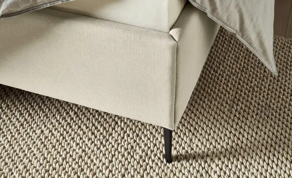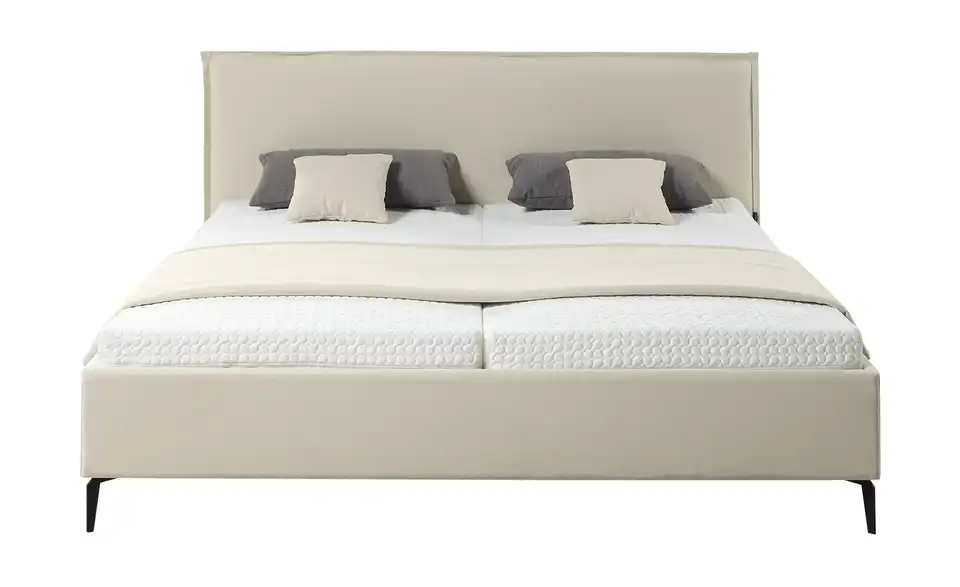 Das Polsterbettgestell Elos von Musterring kombiniert zurückhaltendes Design mit modernen Akzenten. Das markante Kopfteil ist mit einem attraktiven Doppel-Stehsaum verziert und wirkt dekorativ, ohne zu dick aufzutragen. Die filigranen Winkelfüße aus anthrazitfarbenem Metall harmonieren gekonnt mit dem zeitlosen Bezug aus Baumwolle und Leinen. Das Polsterbettgestell lässt sich mit handelsüblichen Lattenrosten und Matratzen kombinieren. Die Einlegehöhe kann in fünf Stufen individuell festgelegt werden. So können Sie ganz einfach ausprobieren, wie Sie am besten schlafen.bewusst wohnen