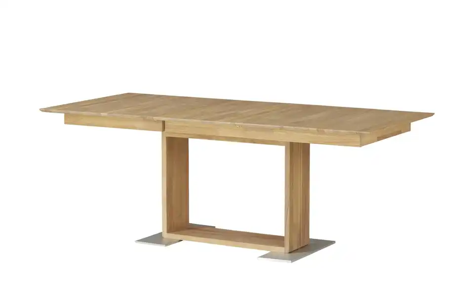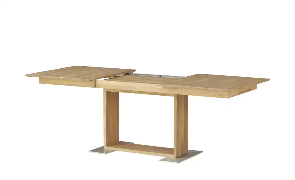 Wie viele Gäste Sie auch erwarten, mit dem Esstisch Mila sind Sie bestens vorbereitet. Mila lässt sich durch den praktischen Mittelauszug mit einer Einlageplatte ganz einfach verlängern. So können Sie die Größe des Tisches je nach Bedarf anpassen. Der Tisch ist aus hochwertigem Massivholz gefertigt und somit stabil und langlebig. Der natürliche Holzfarbton wird durch die Bodenplatte in Edelstahloptik geschmackvoll akzentuiert.Lieferung & Versand