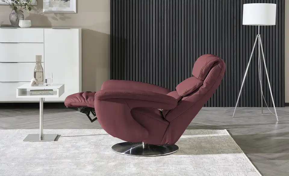 Entscheiden Sie sich für höchsten Sitzkomfort in stilvoller Form. Der Leder-Relaxsessel von himolla erfüllt auch hohe Erwartungen an Komfort und Design. Softes Echtleder umspannt den gesamten Sessel, welcher von einem Drehfuß in attraktiver Edelstahl-Optik getragen wird. Die hohe Rückenlehne besitzt drei besonders dick gepolsterte Bereiche und sorgt für Entspannung pur. Die breiten, weichen Armlehnen sind mit einer dekorativen Ton-in-Ton-Ziernaht versehen. Mit dem dezent integrierten Verstellhebel können Sie kinderleicht die Position der Rückenlehne anpassen. Die Fußstütze lässt sich mit etwas Körperdruck nach oben klappen. Den Leder-Relaxsessel von himolla gibt es in drei Ergonomiegrößen, sodass er Ihren individuellen Komfortansprüche noch besser entspricht. Polster gefertigt im bayrischen Taufkirchen: Von Menschen für Menschen. Die hochwertigen Funktionsmöbel der Marke himolla besitzen durchdachte Verstellfunktionen und begleiten Sie ein ganzes Möbelleben lang.Lieferung & Versand