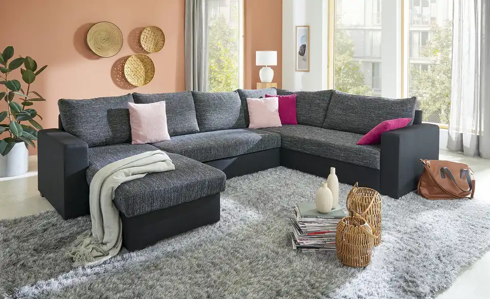 Diese Sofagarnitur schafft eine ausgesprochen gemütliche Atmosphäre. Das Modell Maxima hat eine Polsterung aus Schaumstoff für noch mehr Sitzkomfort und lässt sich dank des echt bespannten Rückens frei im Raum platzieren. Das Sofa verfügt über ein Gestell, welches aus Kunststoff besteht. Um Rückenkissen brauchst Du Dir keine Gedanken mehr zu machen, denn diese sind bereits im Lieferumfang inbegriffen. Das Modell Maxima dient aufgrund des praktischen Bettkastens als Stauraummöbel und nimmt insgesamt 303 x 87 x 216 cm ein. Mit dieser Couch gestaltest Du Dein Zuhause behaglich.Lieferung & Versand